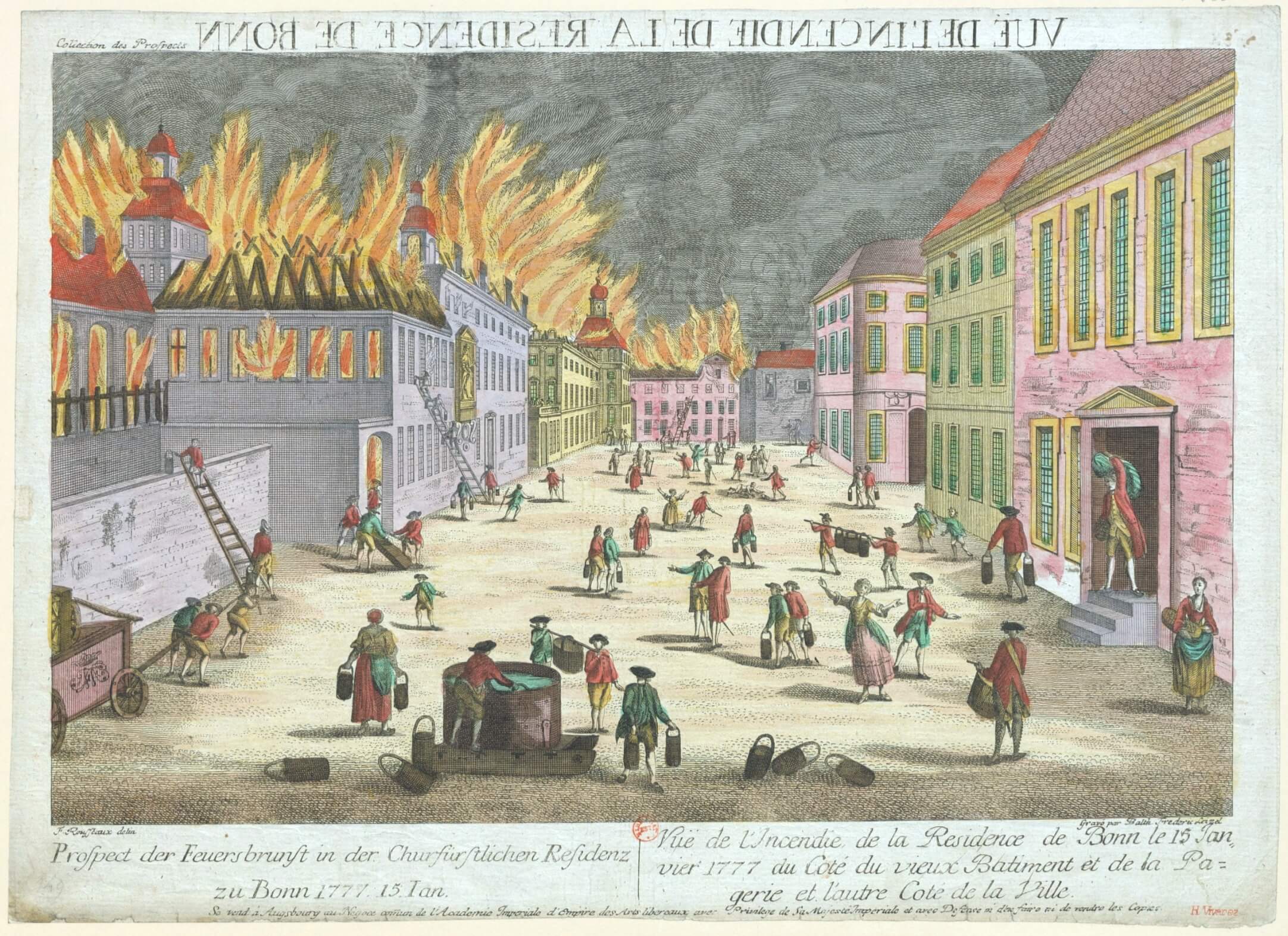 Fire at the Electoral Residence, 1777 Coloured engraving, by Balthasar Friedrich Leizelt, published 1780