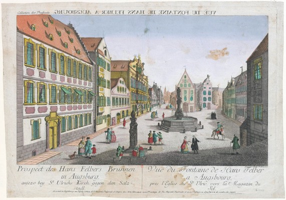 View of the fountain of Hans Felber at Augsburg's Ulrich Square, Augsburg Coloured engraving, by Balthasar Friedrich Leizelt, published 1770