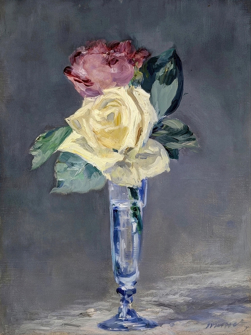 | Roses rest in a champagne flute, their petals loosely gathered while the leaves spread outward and soften the tall, narrow form of the glass. Manet displays his masterful use of colour through pink, green, and lemon yellow set against cool grey, creating a tonal balance that arrests the viewer’s attention.. |