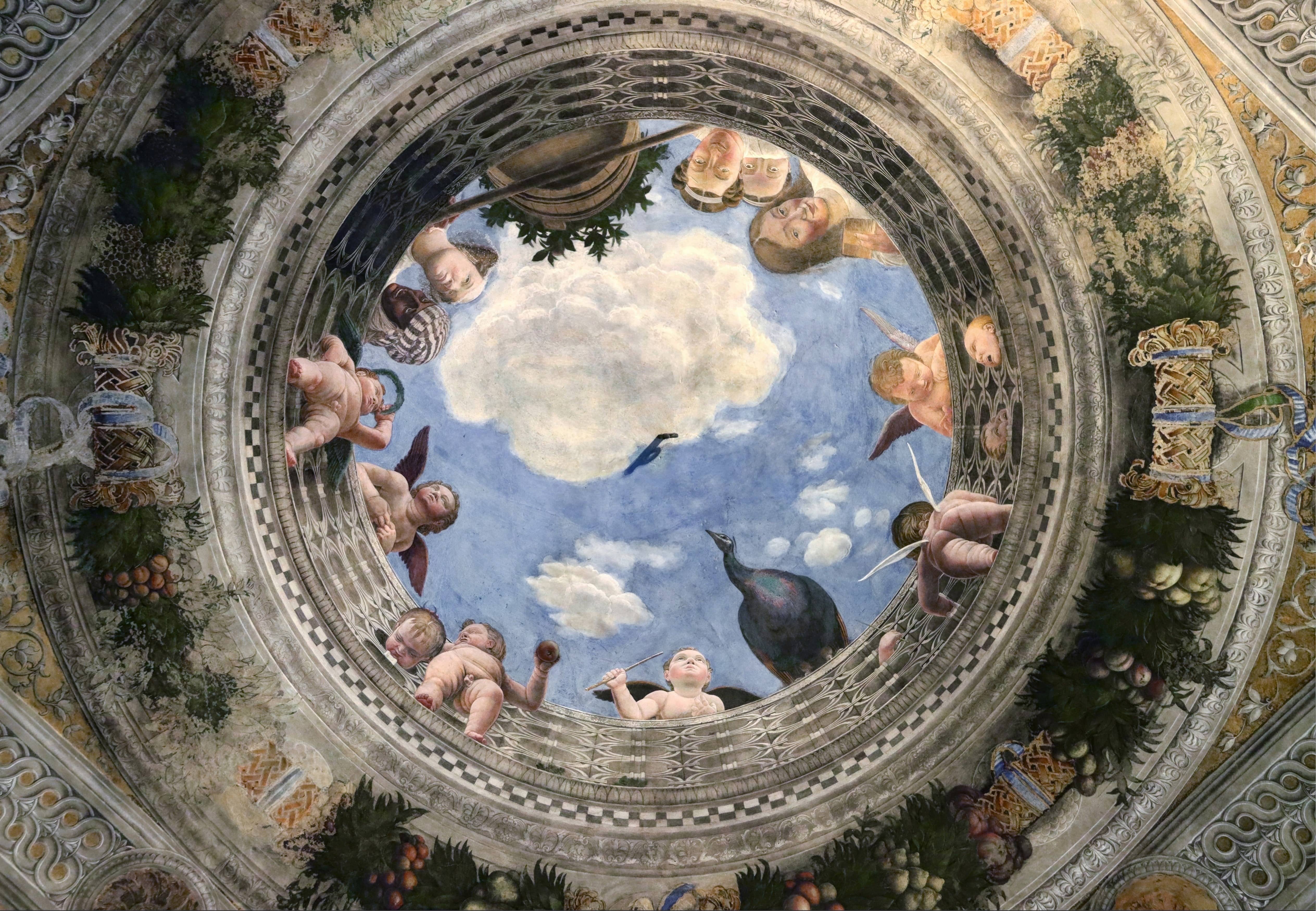 | An illusionistic view upward through an oculus into open sky, populated by cherubs and onlookers who appear to lean over a stone balustrade. Perspective is handled with great assurance, giving the figures a vivid presence and creating the impression that the ceiling has opened above the viewer. Part of a fresco cycle covering the walls and ceiling of a private audience and reception chamber, commissioned by the Marquis of Mantua as a statement of dynastic pride, learning, and authority, presenting the ruling family as cultured, legitimate, and closely aligned with classical ideals and divine favour. |