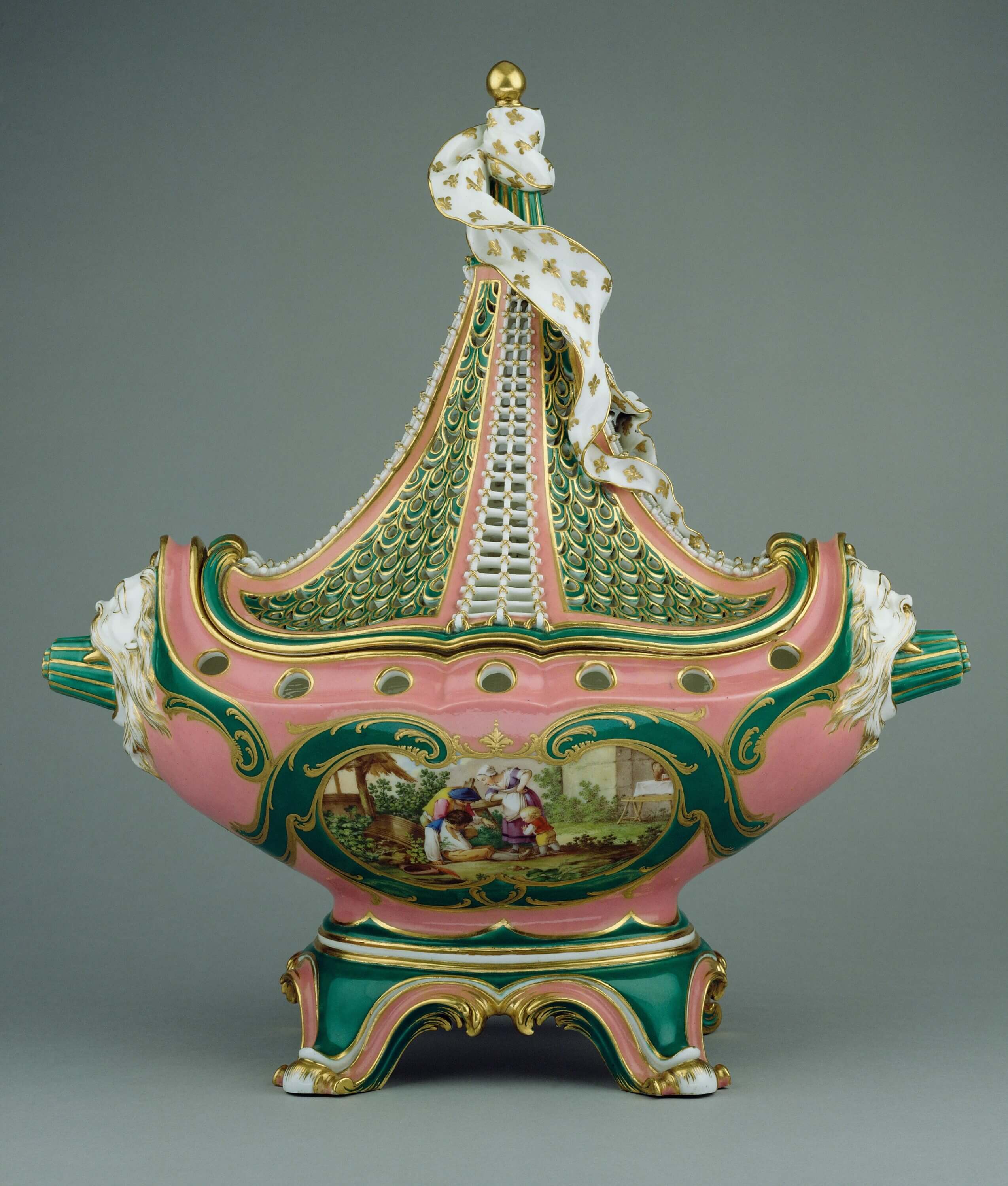 Lidded pot-pourri vase Soft-paste porcelain; polychrome enamel decoration and gilding, 37.5 x 34.8 x 17.3 cm, Sèvres manufactory, c. 1760 Painting on front panel attributed to Charles-Nicolas Dodin J. Paul Getty Museum
