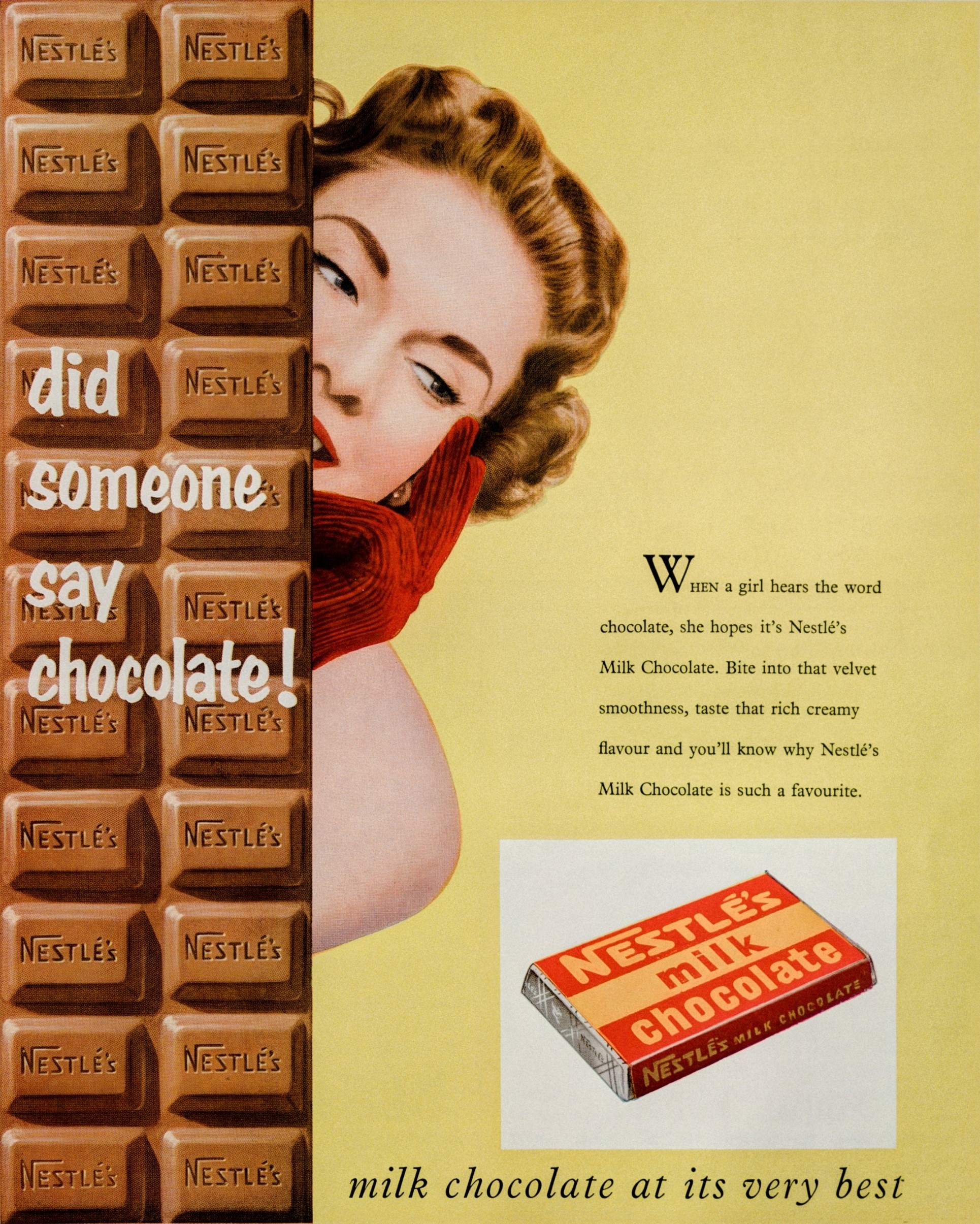 | One of Nestlé's seductive chocolate advertisements from the 1950s presenting a glamorous young woman peering from behind an oversized bar, linking desire and femininity with the promise of sweet indulgence. The warm colours, smooth illustration, and confident slogan work together to present milk chocolate as an essential pleasure in post-war domestic life. |