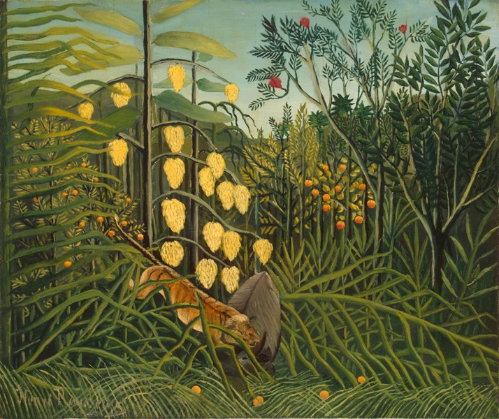In a Tropical Forest. Struggle between Tiger and Bull Oil on canvas, 46 x 55 cm, by Henri Rousseau, c. 1908–09 The State Hermitage Museum, Saint Petersburg