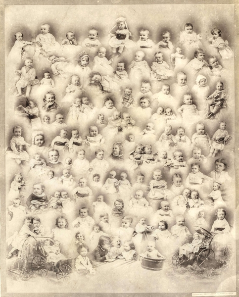 Montage photo of miniature portraits of toddlers Albumen photographic print, by Joshua Smith, after 1877