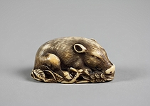 | Izumiya Tomotada was one of the three great netsuke carvers active in Kyoto. He worked with both ivory and wood, specialising in the depiction of oxen, which became his most iconic subject. His carvings are known for their exceptional detail, lifelike expressions, and smooth, polished surfaces, often capturing the natural posture and movement of animals. While oxen were his primary focus, he also carved dogs, tigers, and other creatures, each crafted with a sensitivity that revealed his mastery of form and texture. Tomotada’s netsuke were highly sought after during his lifetime, and the demand for his work was so high that counterfeits started appearing while he was still active. Many of his students and followers also signed their works with his name, making it difficult to tell his genuine pieces from those by others in his style. Identifying authentic works is especially challenging because of the numerous imitations and the practice of pupils using his signature. Despite these complications, Tomotada's netsuke are regarded as the finest examples of the Kyoto school. | ||||||||||