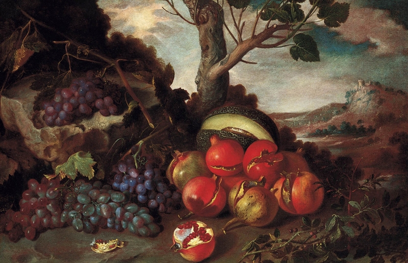 Still life in Landscape (Pomegranates) Oil on canvas, 72.5 x 109.3 cm, by Tomás Yepes, 1650–60 BBVA Collection, Spain |