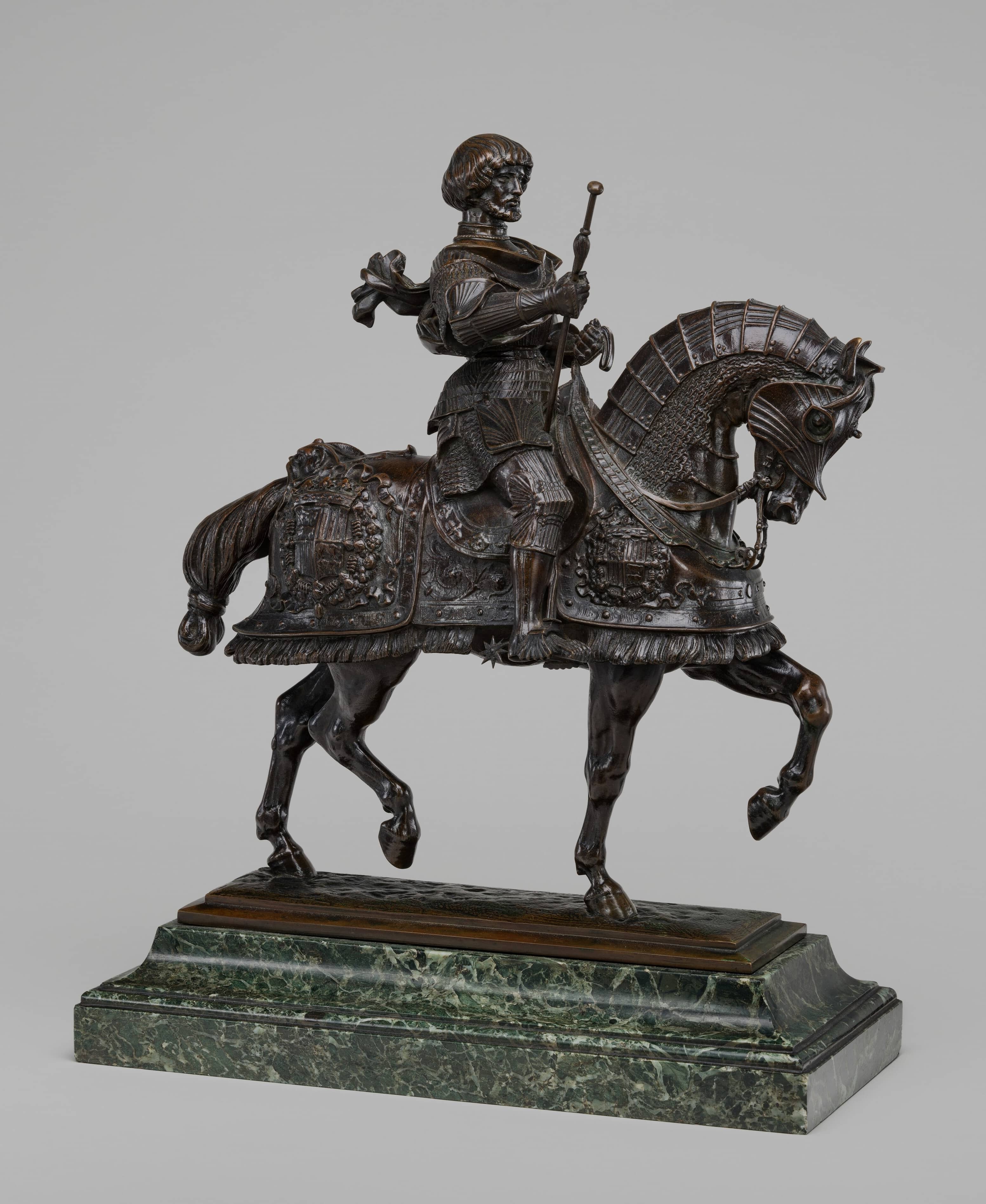 | The duc de Nemours is depicted by Barye in a work conceived during a broader revival of French national history, shaped by Romantic fascination with heroism and chivalric identity. The duc, killed at the Battle of Ravenna in 1512, is shown in ornate Renaissance armour, his steady gaze and composed bearing casting him as an idealised figure rather than a portrait drawn from life. Though the horse stands still, there is a quiet force in its form, typical of Barye’s command of animal anatomy, yet the overall effect remains measured, in keeping with the traditions of classical and early modern equestrian statuary. .
