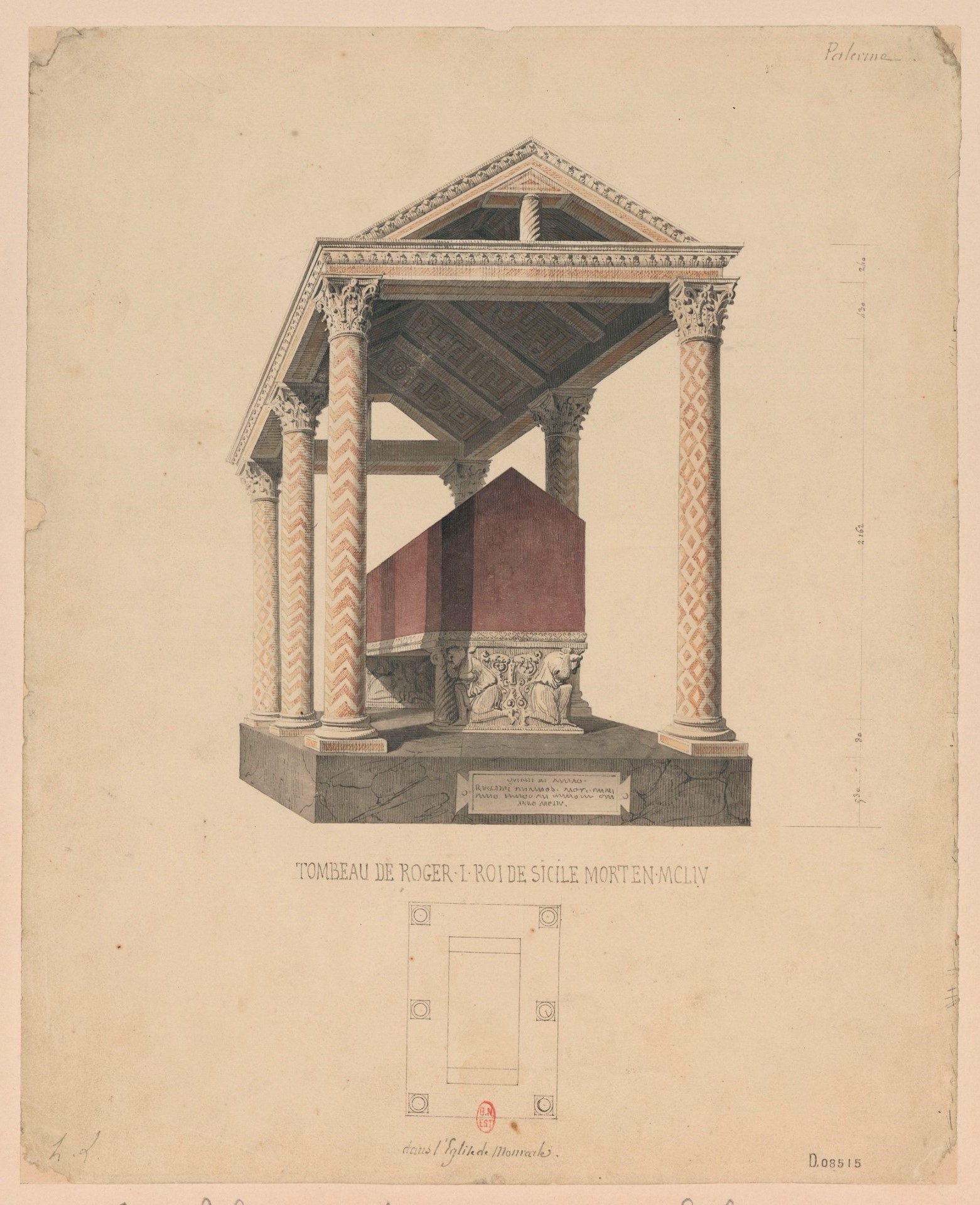 Tomb of Roger I, King of Sicily, died MCLIV, Duomo Santa Maria Nuova, Monreale Graphite, pencil, coloured wash on paper, by Henri Labrouste, 1858, Bibliothèque nationale de France