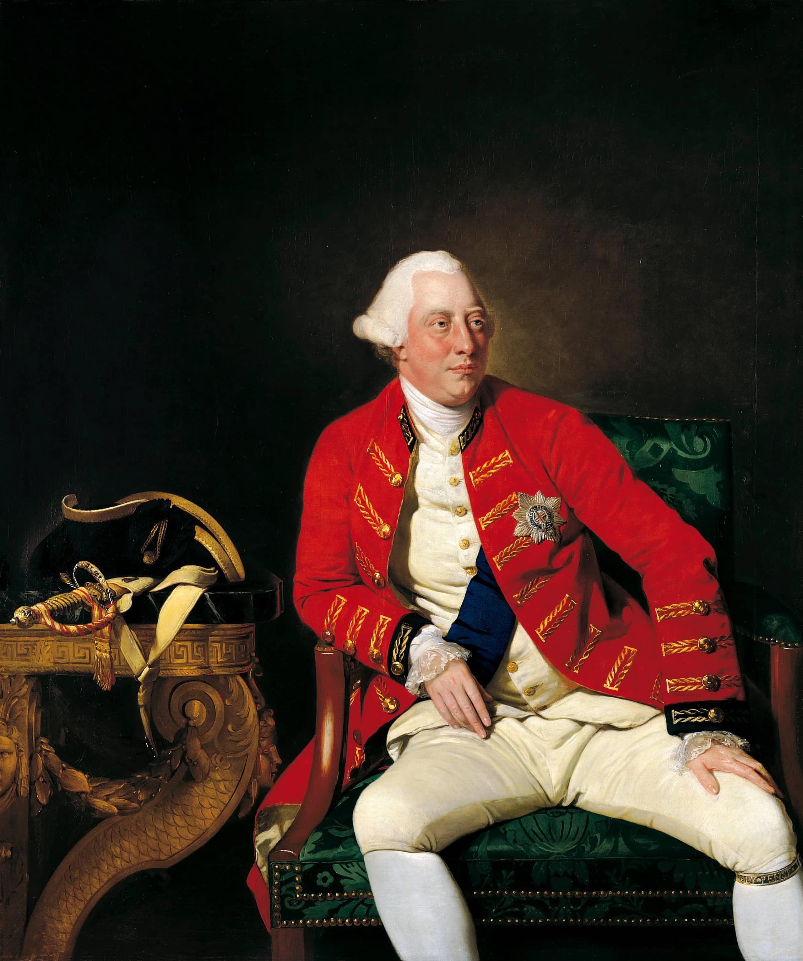 | Zoffany presents the monarch in a moment of poised introspection, dressed in the scarlet uniform of a British general, which emphasises his role as both king and commander. Although he is composed and dressed formally, his posture is relaxed. He wears the riband and star of the Order of the Garter, and on his left leg is the garter itself. Despite his position, King George III preferred simplicity, modesty, and an unostentatious way of life, and in the visual arts was less drawn to grandeur than some of his predecessors. |