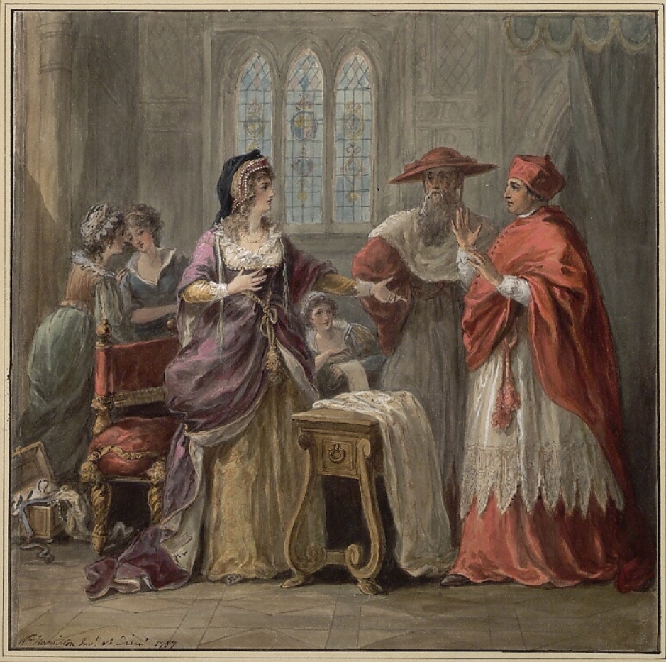 The Queen being urged by Cardinals Wolsey and Campeggio to agree to divorce Henry VIII Watercolour, by William Hamilton, 1787, Albertina
