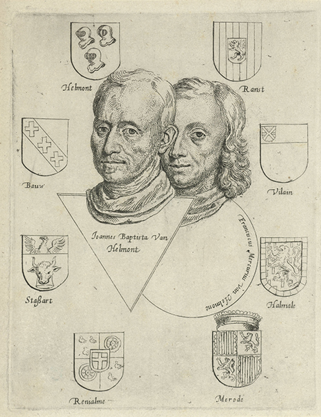 Joannes Baptista van Helmont with his son Franciscus Mercurius surrounded by various family arms etching by Cornelis de Man, 1648, Rijksmuseum