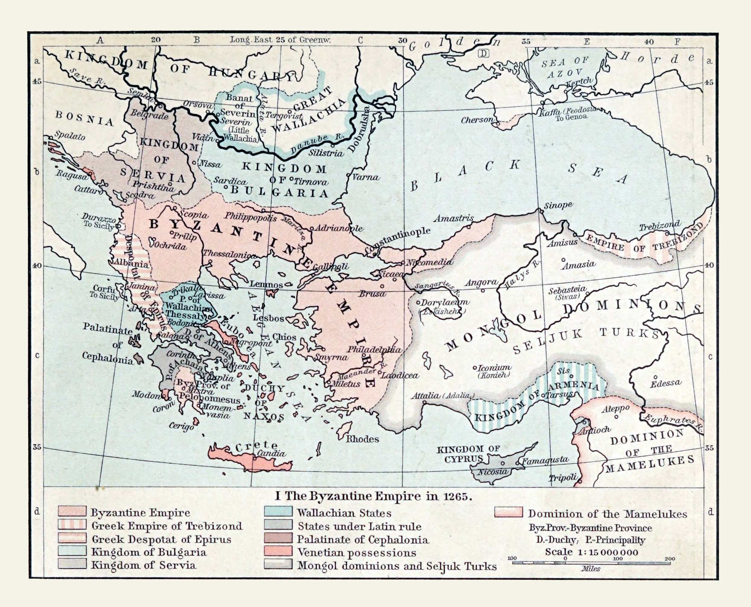 | In 1265, the empire was facing a decline in influence as it struggled against pressure from neighbouring states, including the Greek Empire of Trebizond, the Kingdom of Bulgaria, and the Kingdom of Serbia. The Mongol dominions, Venetian possessions, and Mamluk territories further fragmented the political landscape. This instability marked the decline of the Byzantine Empire's dominance in the region. |