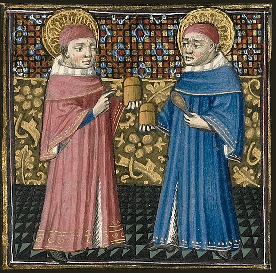Saints Damian and Cosmas Tempera colours, gold leaf, paint, and ink on parchment Workshop of the Bedford Master, c. 1440-50, book of hours, from the Ms. Ludwig IX 6 J.P. Getty Museum