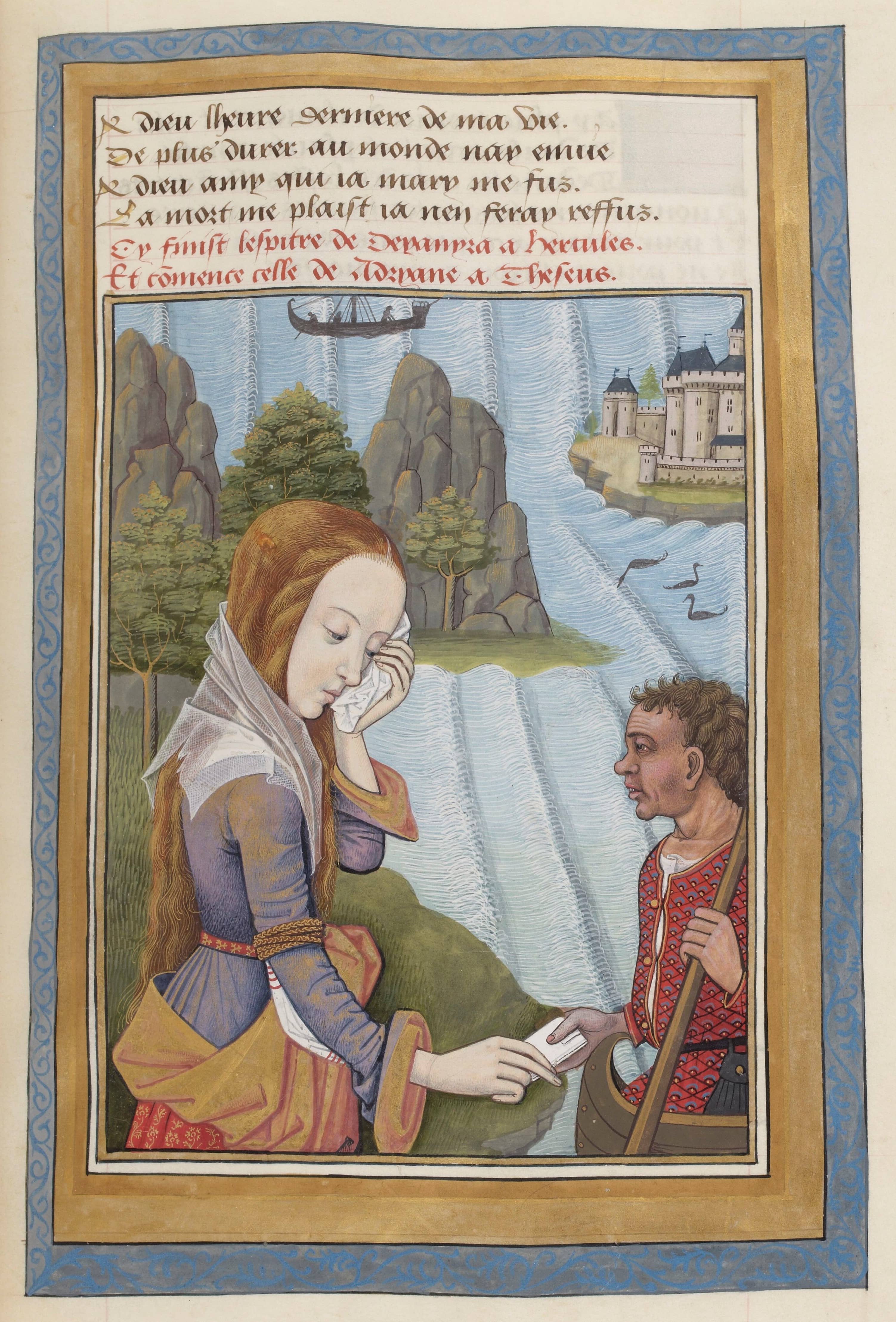 Ariadne writes a letter to Theseus Illuminated manuscript, by Robinet Testard, 1496–97 Bibliothèque nationale de France |