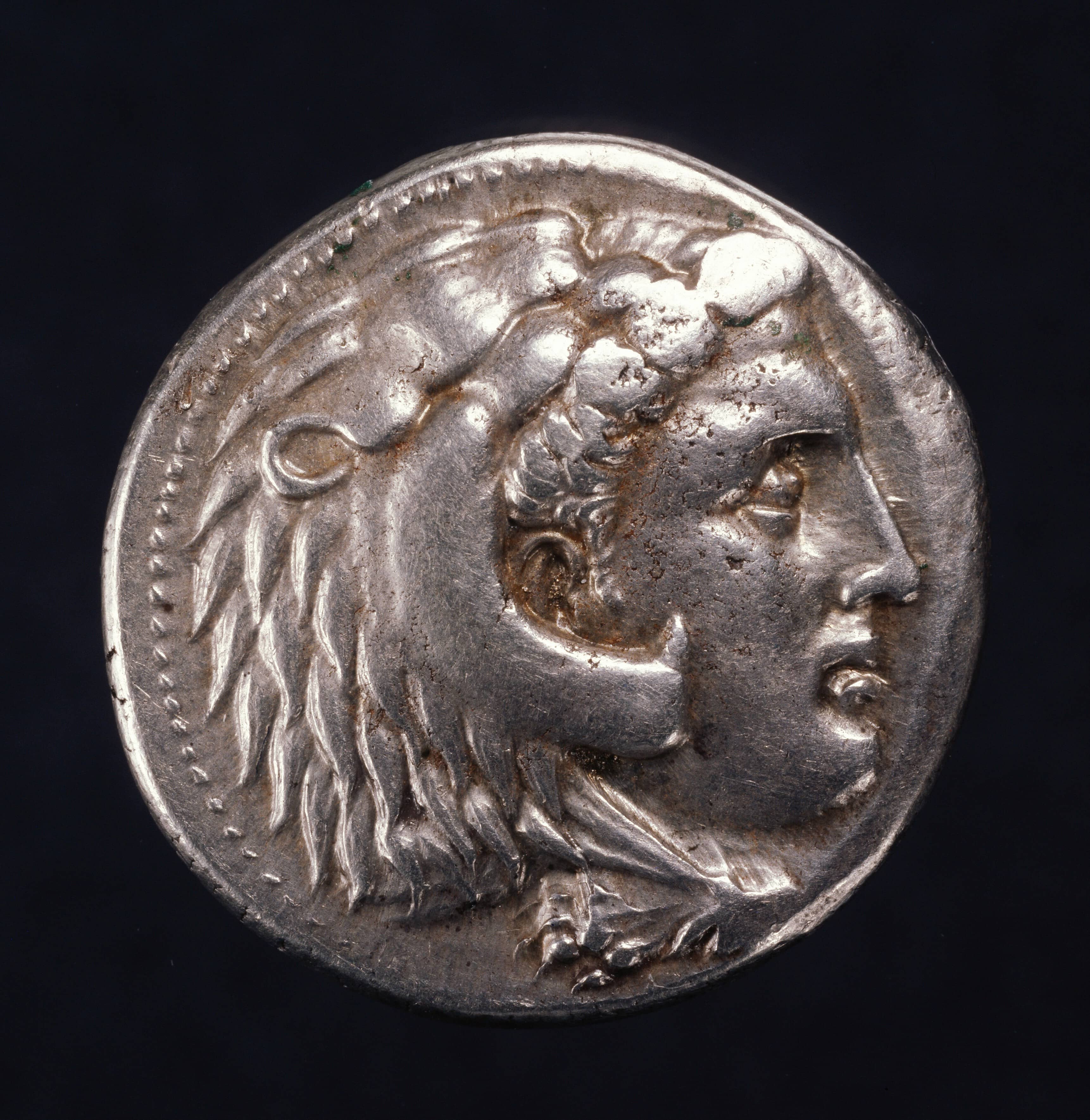 Tetradrachm of Lysimachus [obverse] Silver, anonymous, 336-232 BC Created in Anatolia during the reign of Alexander III, the coin depicts the head of Heracles in lion skin headdress J.P. Getty Museum
