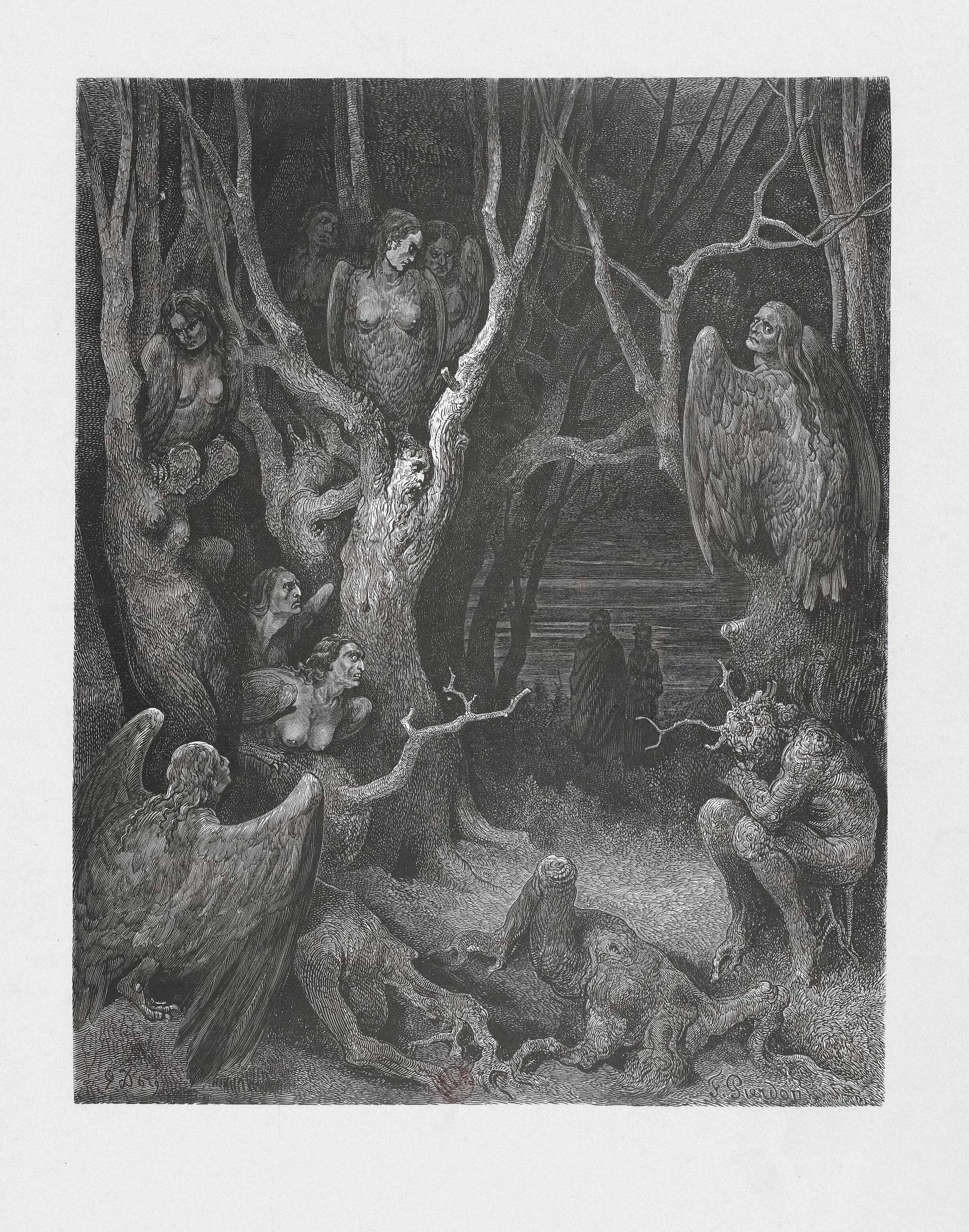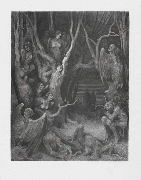 'There do the hideous harpies make their nests' Woodcut engraving for Dante's Divine Comedy, published 1861 by Librairie de L. Hachette Designed by Gustave Doré, engraved by François Pierdon