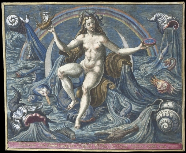 The element water, personified by Venus as water goddess Engraving, by Adriaen Collaert, after Maerten de Vos, 1580-84, Rijksmuseum