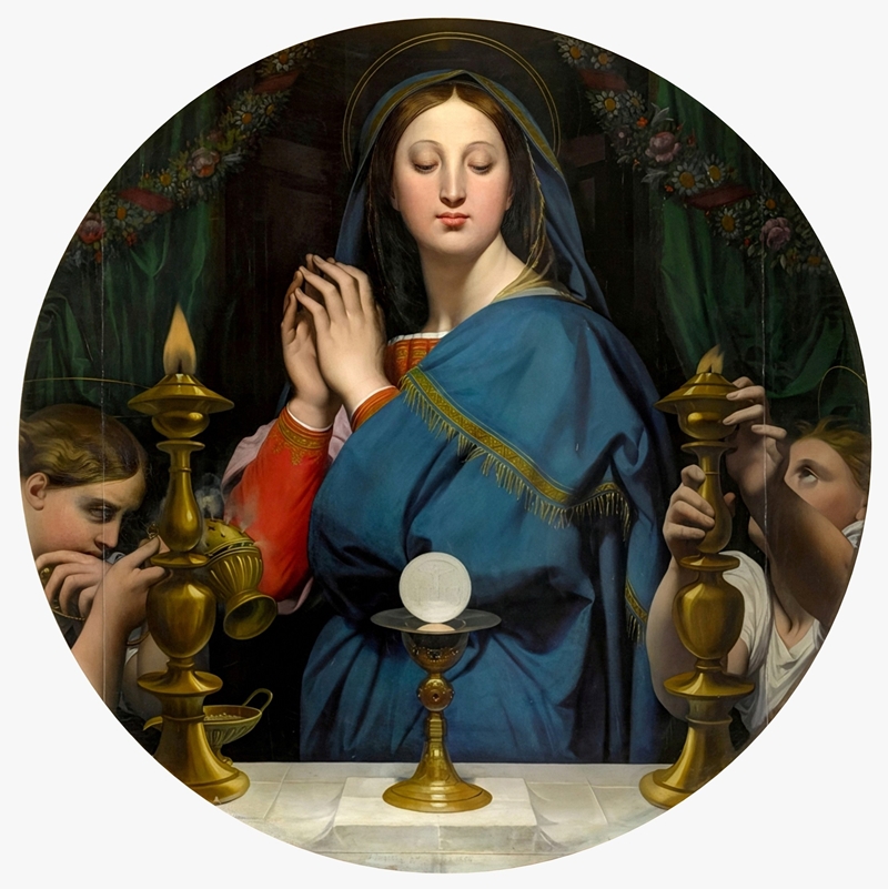 The Virgin with the Host Oil on canvas, 113 cm diameter, by Jean-Auguste-Dominique Ingres, 1854 Musées d'Orsay, Paris |