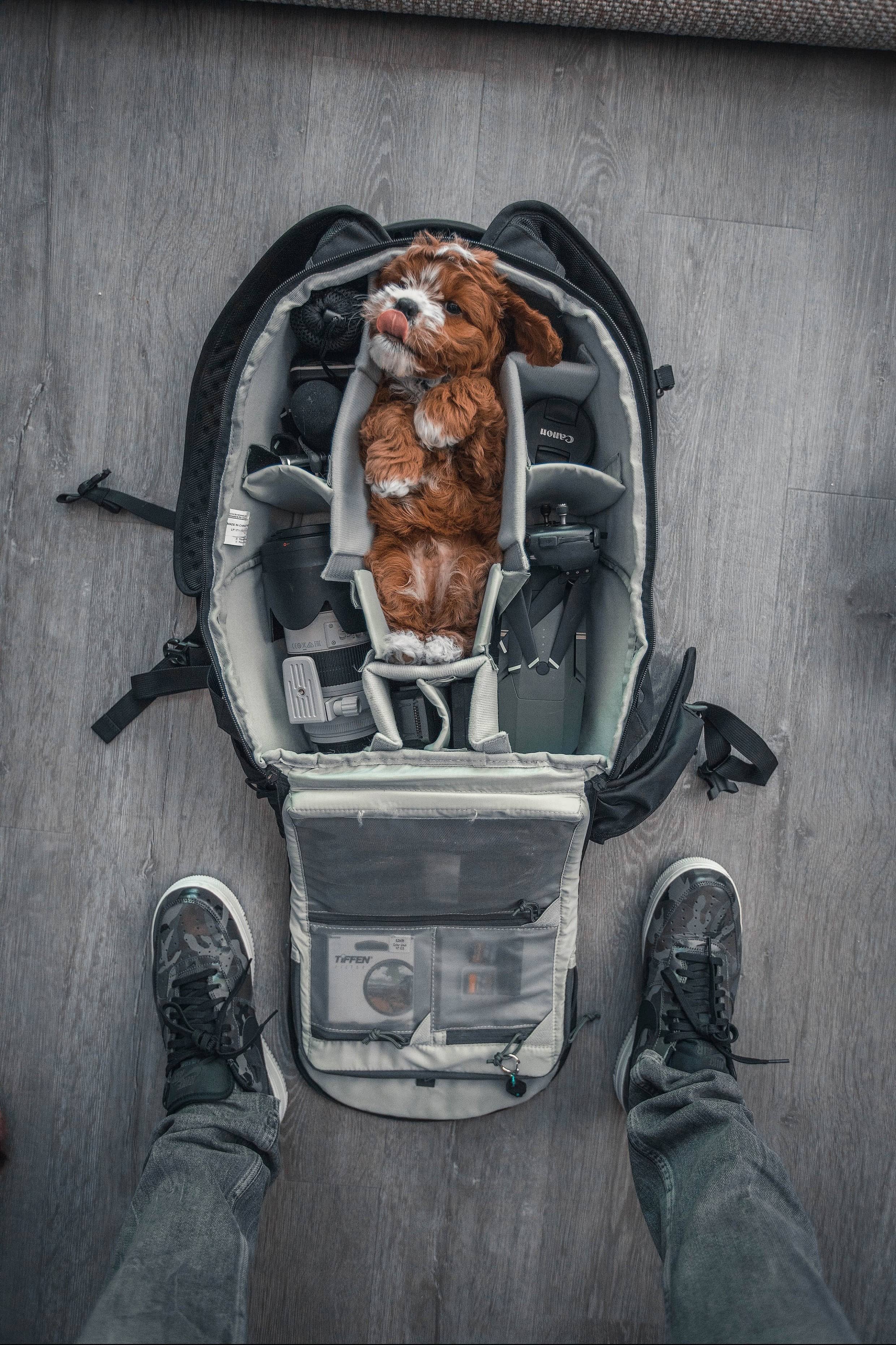 | Nestled within the padded confines of a rather large camera bag, typically reserved for precision-crafted lenses and humming gadgets, lies a small dog, comfortably curled up as though this is precisely where it belongs. Its paws are folded in quiet triumph, its tongue lolling out in foolish delight, as though it knows full well it has displaced tools of great import and couldn’t care less. Around it, instruments meant to aid in the capture of time and light sit patiently, outshone by this soft, ridiculous monarch of the moment. It’s as if, in the face of such unintentional charm, all the technology in the world becomes redundant—this creature alone is enough to capture the moment. |