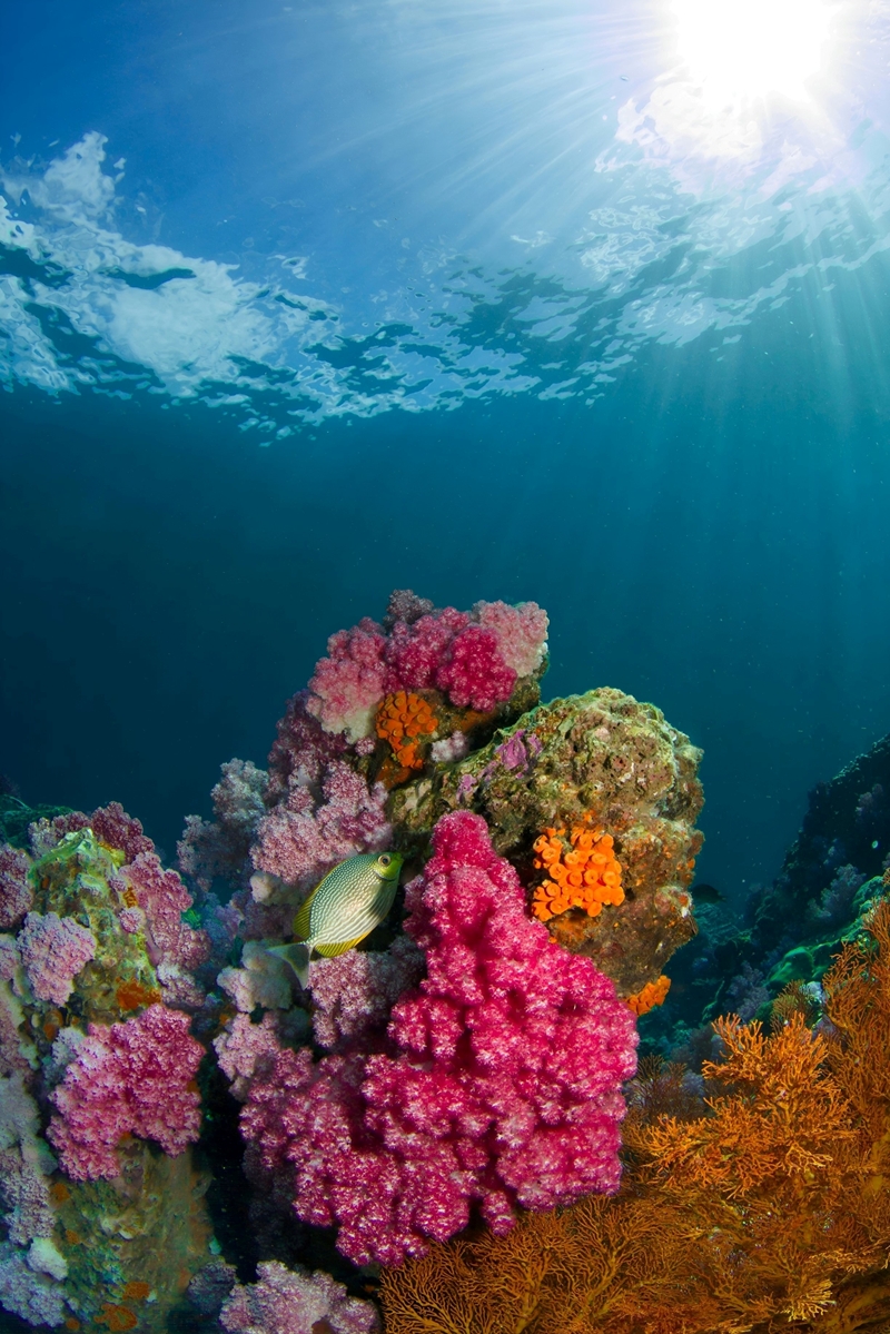 | In the waters off Ko Lipe in Thailand, sunlight pours through the sea and settles over a reef blazing with pink, orange and gold, giving the scene an otherworldly brilliance. A single fish moves briskly between the knobbly clusters and domed masses of the soft corals. |