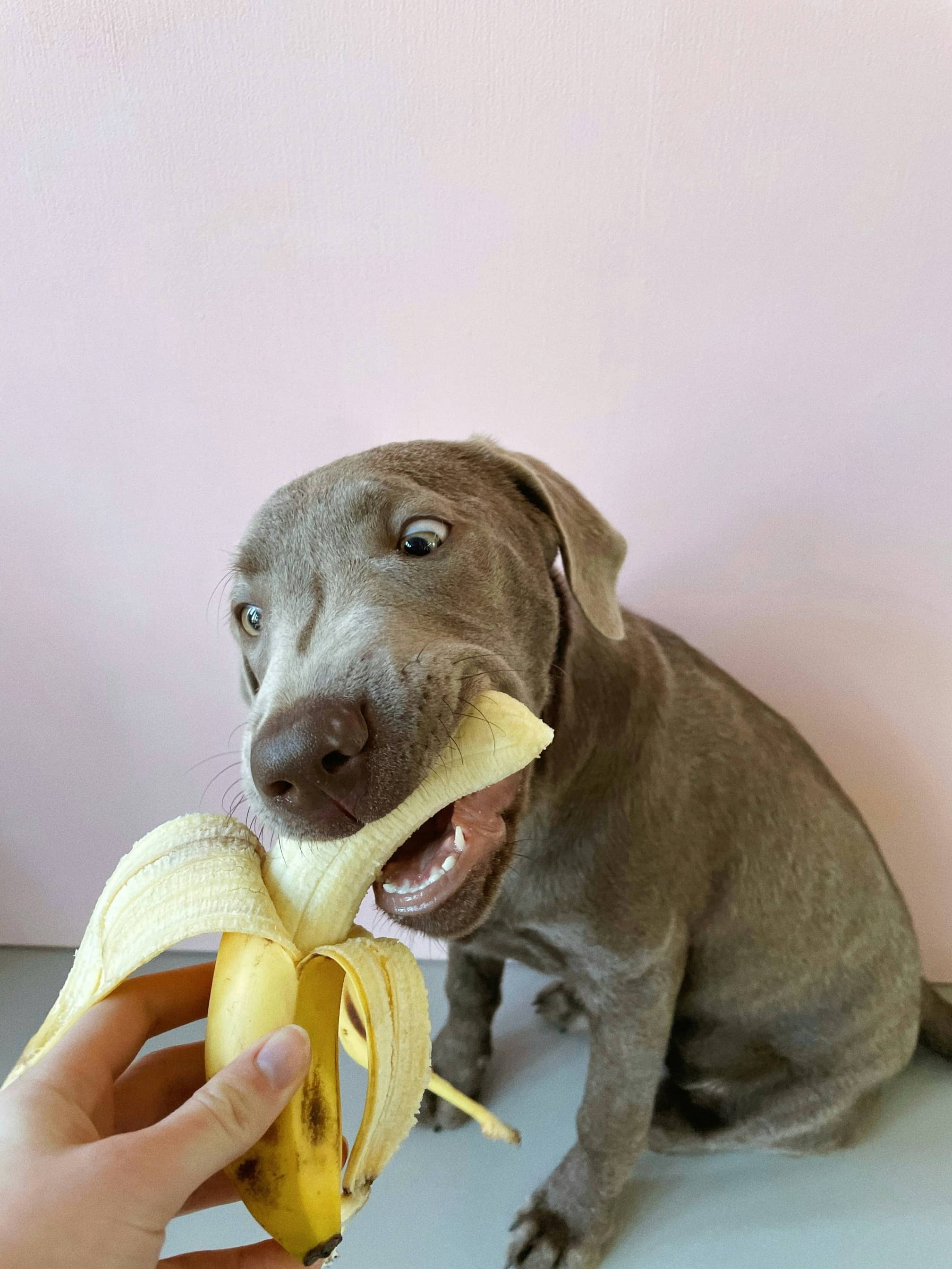 peeled banana with comic urgency, teeth bared in gleeful