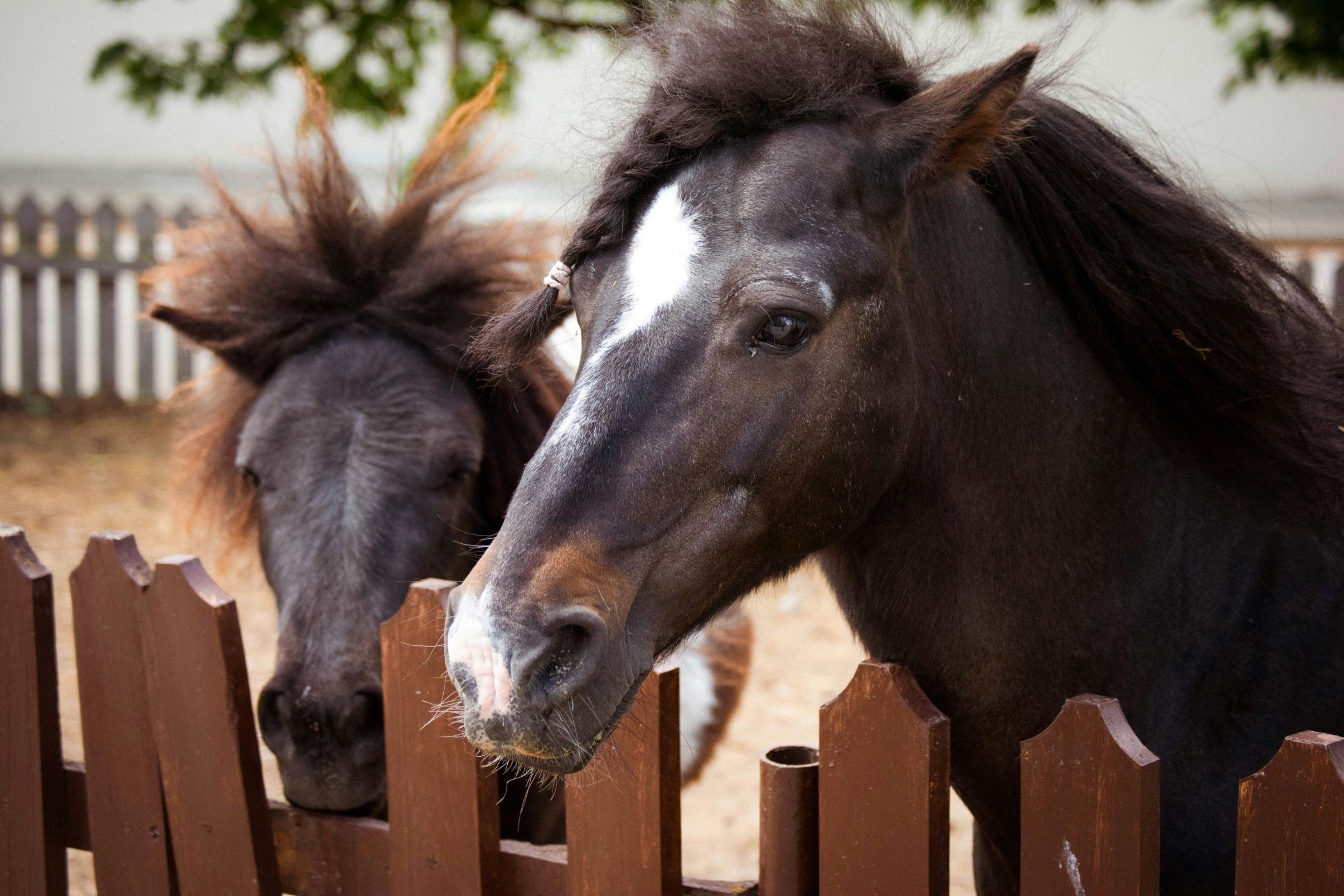 | Two horses peer over a fence, set apart by nothing more than their hair, one with her mane tossed over the side of her neck, finished with a single braid at the fringe, the other flaring upward like a crown of broken spears. An elaborate display of grooming for two creatures waiting for a bucket of oats. |
