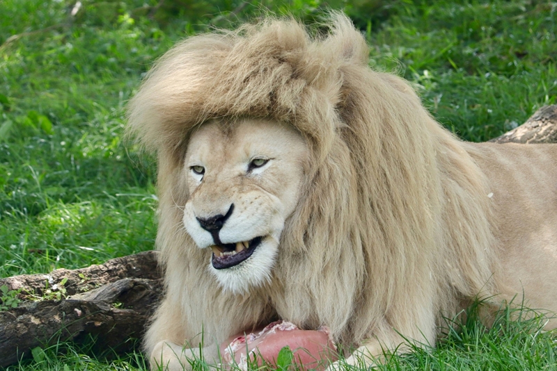 Lion rests on the grass with a full mane shaped into an almost coiffed style. Lion holds a piece of meat between its paws while giving an alert, half-open-mouthed look.