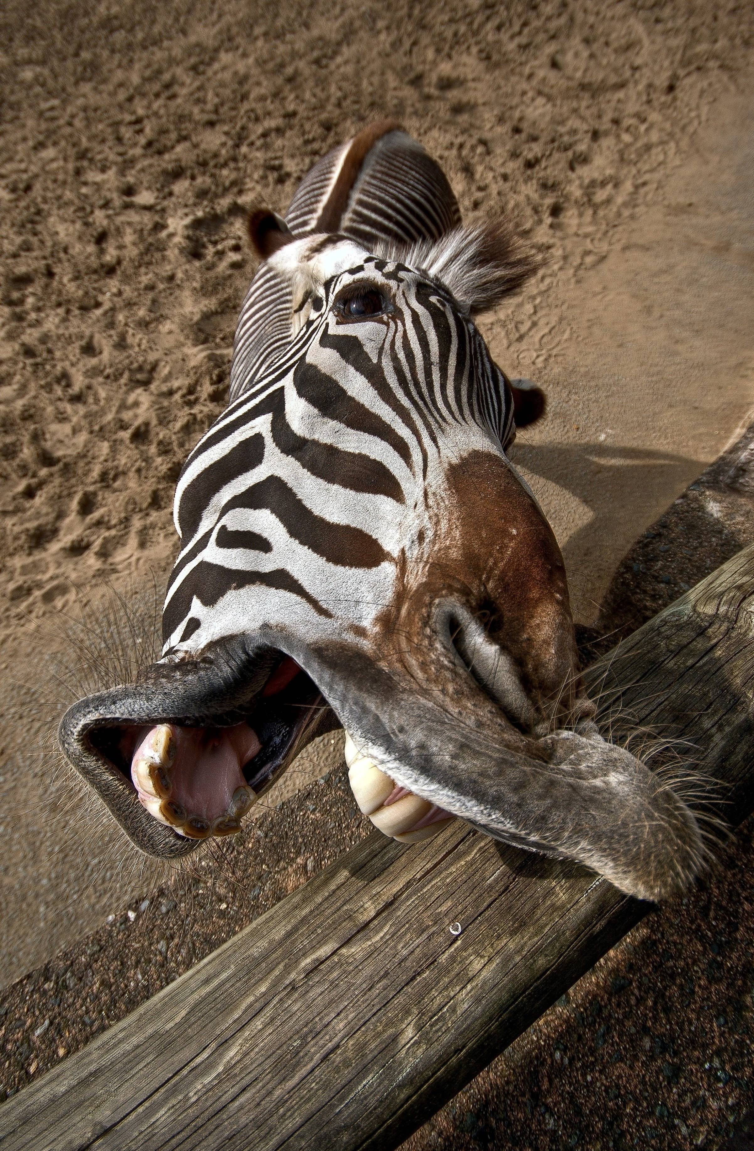| A wide-mouthed zebra that puts its sturdy incisors and fleshy gums on full display, twisting its snout into a grotesque snarl. Stripes and gums captures a raw, undignified side of the animal that shatters its usual graceful poise. |