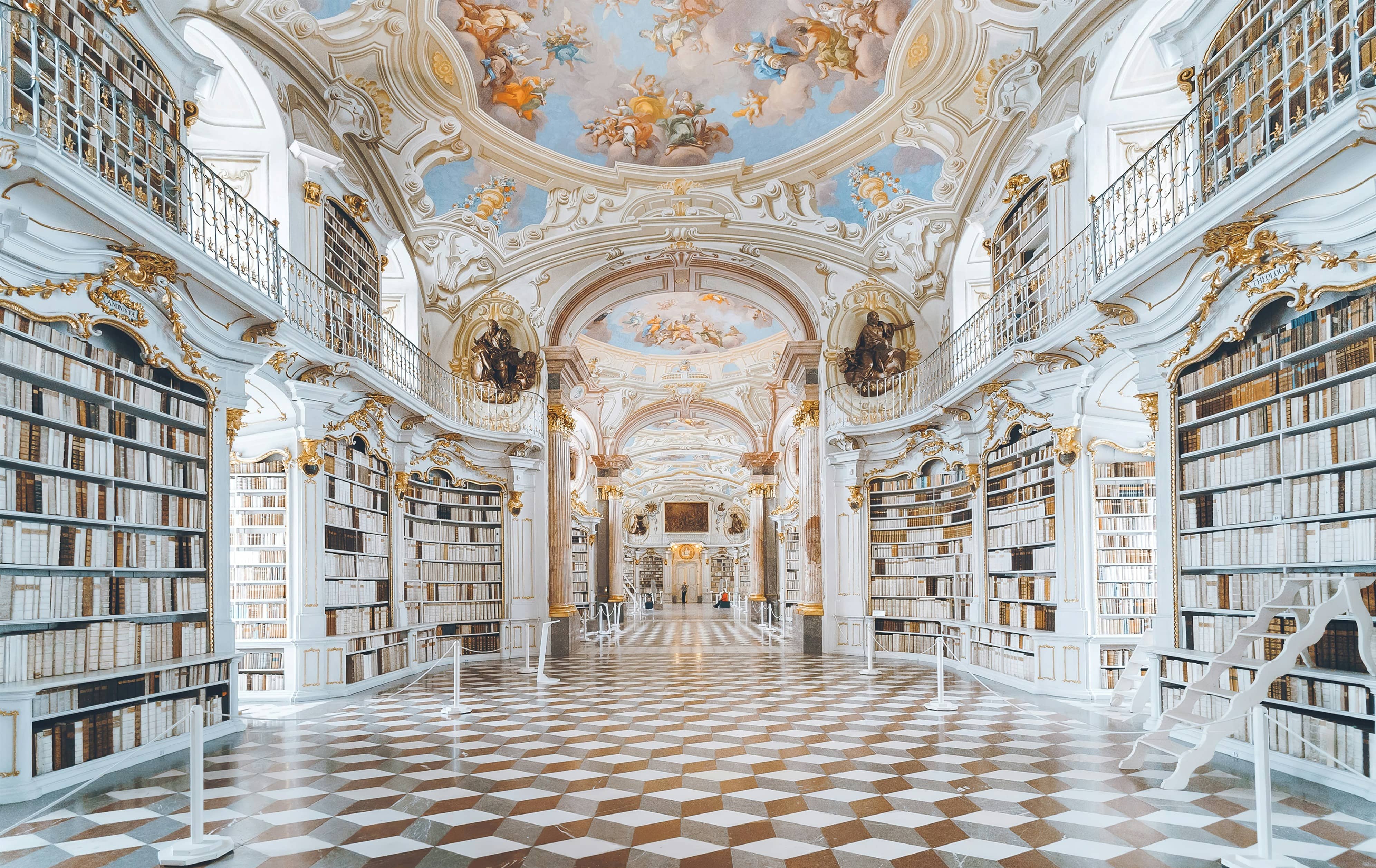 | The Admont Abbey Library, located in the Benedictine monastery of Admont in Styria, Austria, is renowned as the largest monastic library in the world. Constructed between 1774 and 1776, it was designed by Joseph Hueber, who incorporated Enlightenment principles into its architecture, emphasising light, symmetry, and openness. The library's interior is a striking example of Baroque artistry, featuring ornate stucco work and gilded accents, with seven ceiling frescoes painted by Bartolomeo Altomonte. These frescoes represent the stages of human understanding and the relationship between reason, faith, and divine wisdom. The library also contains a set of intricately carved wooden sculptures by Josef Stammel, including his Four Last Things, which depict life, death, judgement, and eternity with vivid detail and emotion. The library houses approximately 70,000 volumes in its main hall, while the abbey’s total collection exceeds 200,000 works. Among its holdings are 1,400 manuscripts, some dating as far back as the 8th century, and 530 incunabula—early printed books from before 1501. The collection encompasses a wide array of disciplines, including theology, philosophy, law, natural sciences, and the arts, reflecting the abbey’s historical importance as a centre of learning and intellectual pursuit. In addition to its historical volumes, the library incorporates a modern catalogue system to ensure accessibility for scholars and researchers. It is also notable for its efforts in preservation and digitisation, aimed at safeguarding its rare and fragile works for future generations. Beyond its scholarly function, the library is a significant cultural and architectural landmark, attracting thousands of visitors annually. |