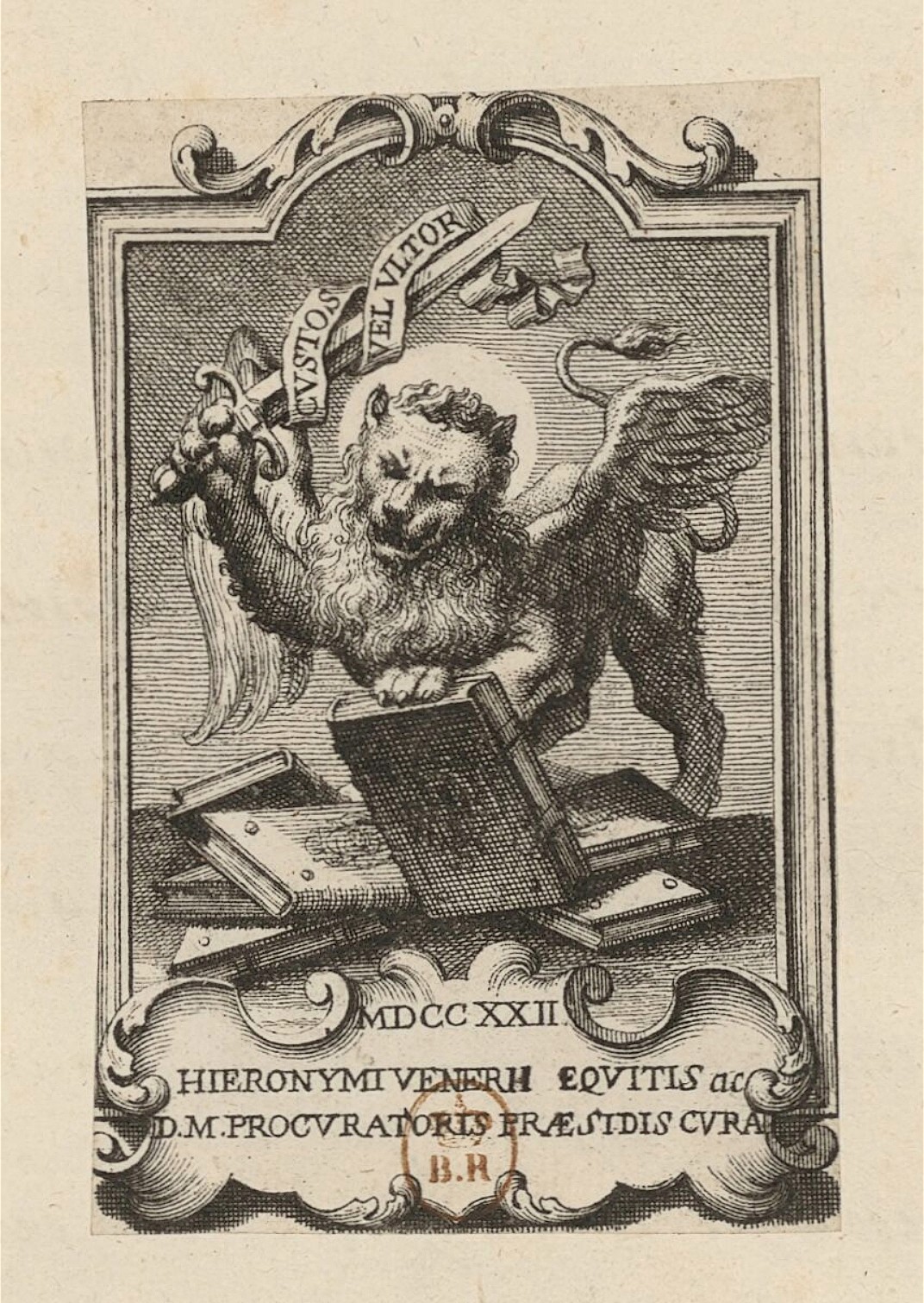 Ex libris of the Marciana Library of Venice (Biblioteca Nazionale Marciana) Engraving by a member of the Zucchi family of engravers in 1722, for the library when Girolamo Venier was librarian between 1709 and 1735.