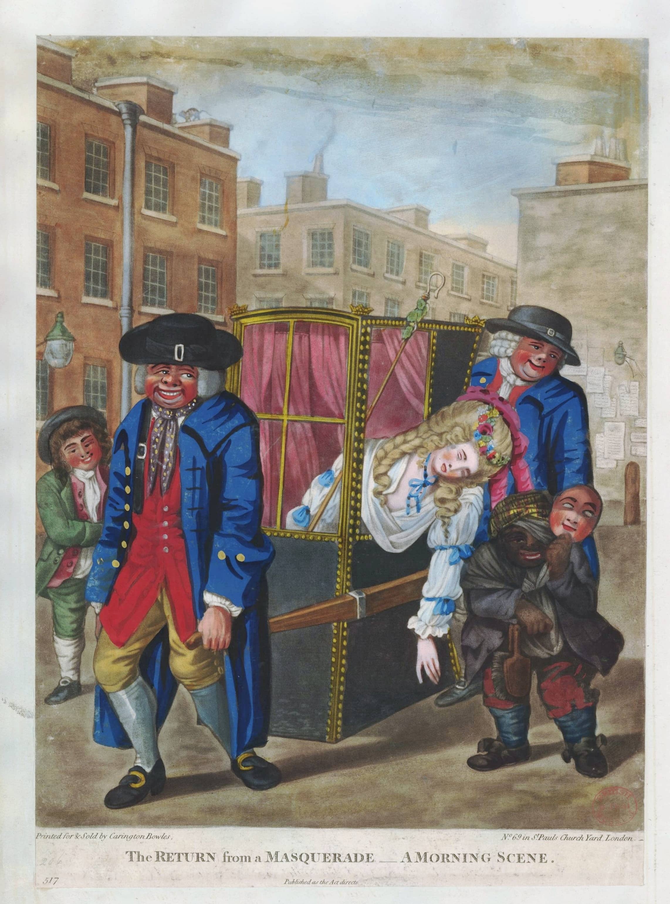chimney-sweep looks on with laughter, holding up a smiling mask. On