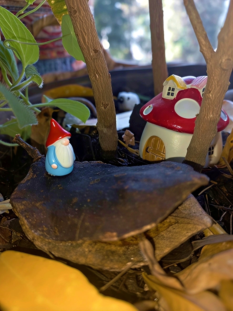 A garden gnome rides a jacaranda pod, not unlike a mission‑bound gondolier, solemn as ceremony. His hat is jaunty; his purpose, not.