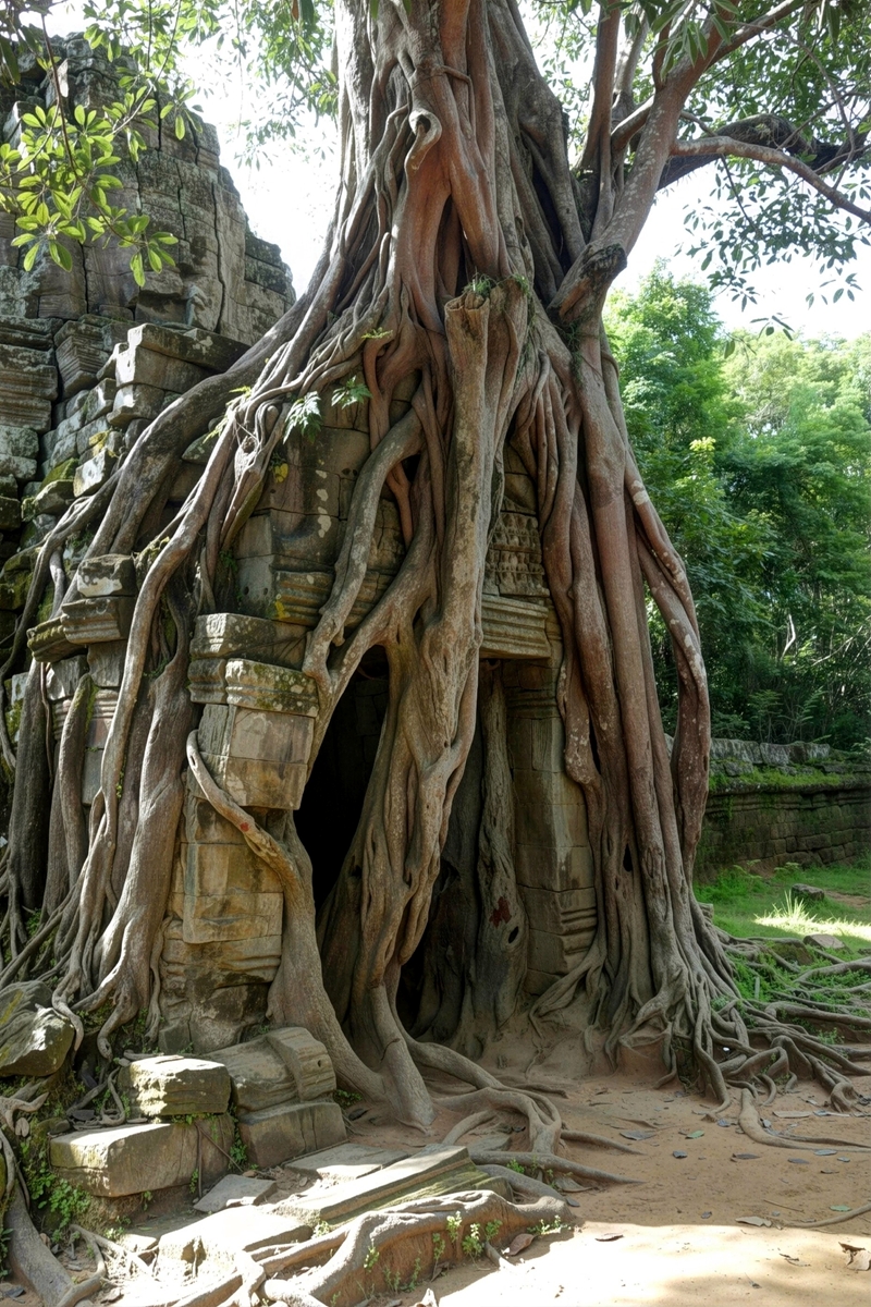 Massive tree roots engulf a stone doorway at a ruined temple in Siem Reap, Cambodia, pressing through carved blocks and framing a dark entrance. Time and growth stand alongside one another as the forest holds the structure in place. |