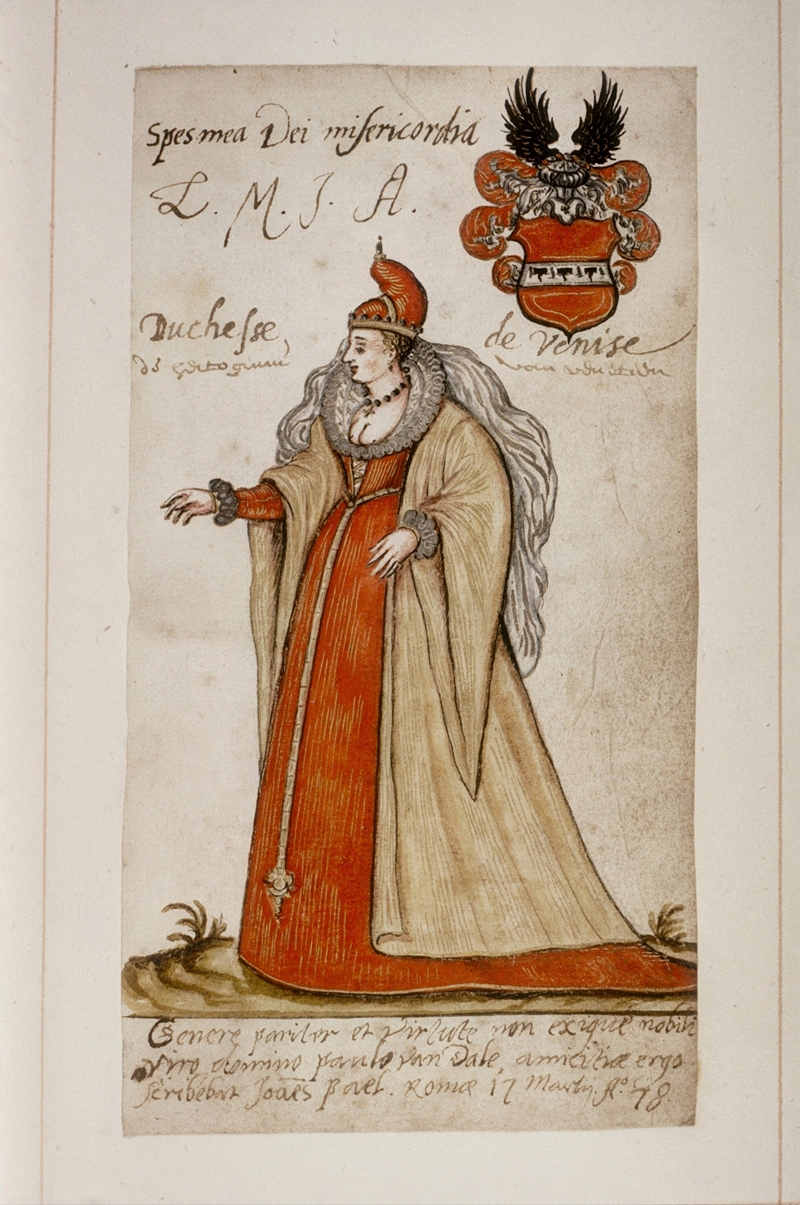 A dogaress of Venice From the Album Amicorum of Paul van Dale, MS. Douce d. 11, anonymous, c. 1569-78 Bodleian Libraries, Oxford |