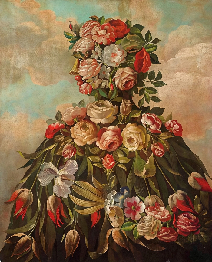 | As with the painting depicting the profile of a man, this composition presents a woman's head formed entirely from flowers, leaves, and curling stems, set against a soft, clouded sky. Painted in the style of Giovanni Stanchi, it reflects his interest in structured floral arrangements and decorative richness, transforming botanical elements into an imagined portrait. Though the concept recalls Arcimboldo’s composite heads, the treatment here leans towards elegance and surface harmony rather than the eccentricity typical of his work. |