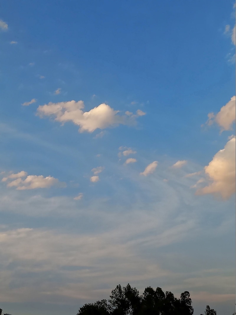Clouds tinted by the sinking sun drift across a deep blue sky above the trees. For a moment, the day seems reluctant to give way to evening.