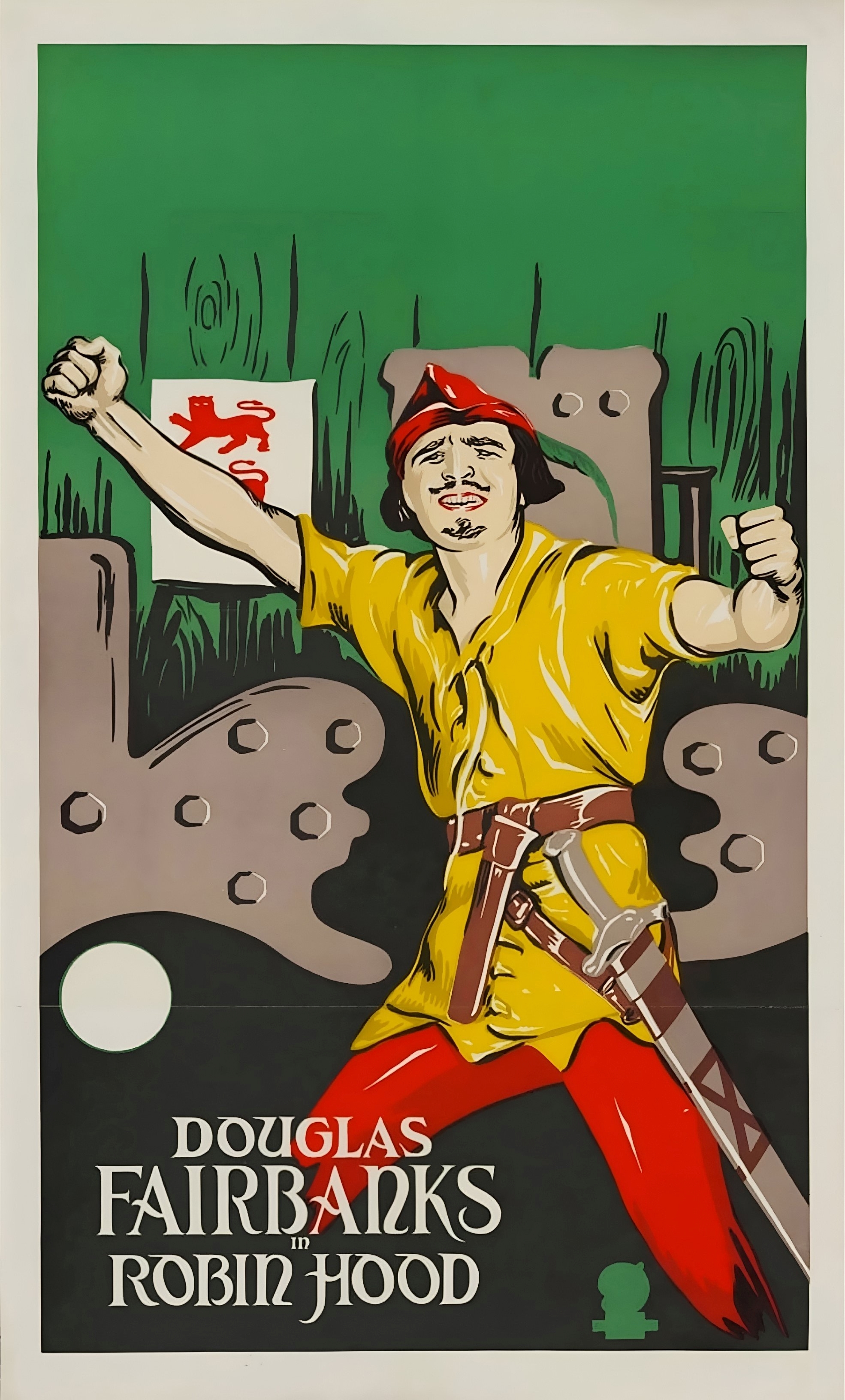 | Bold in both design and ambition, the 1922 film Douglas Fairbanks in Robin Hood and its promotional poster reflect a shared emphasis on spectacle and star power. The poster’s, with Robin in a defiant, exaggerated pose, vivid colours, and stylised backdrop align closely with the film’s large-scale sets, elaborate costumes, and Fairbanks’ characteristically athletic performance. As one of the first major Hollywood productions to adapt the Robin Hood legend with such scope, the film signalled a shift towards more expansive, visually driven storytelling. The artwork channels that intent, presenting Fairbanks as a larger-than-life figure in both narrative and marketing. |