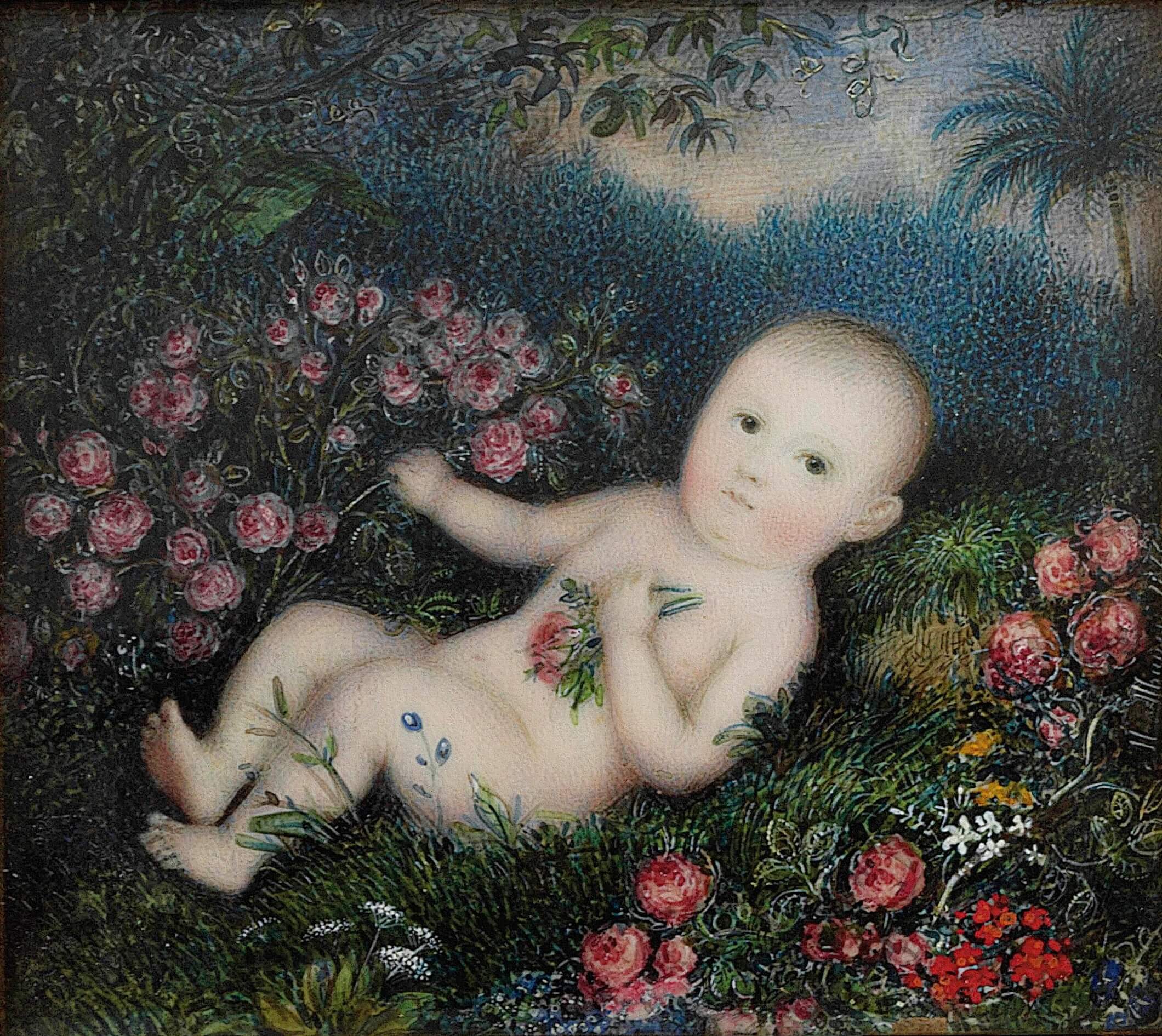 | A baby lies on a grassy surface, on a grassy surface, surrounded by a dense arrangement of flowers and foliage. The figure is placed among blooming roses, with additional floral elements such as bluebells and small white and red blossoms scattered throughout the scene. Both hands hold flowers, while the expression remains calm and direct, with eyes meeting the viewer's gaze. Behind the baby, a mass of dark blue foliage rises toward a light sky, with palm trees faintly visible in the distance. Albanesi’s technique is evident in the precision of the botanical detail and the smooth, luminous modelling of the figure, achieved through delicate layering of watercolour on ivory. His handling of texture and tone creates a subtle contrast between the softness of the skin and the crisp, finely edged forms of the surrounding plants. |