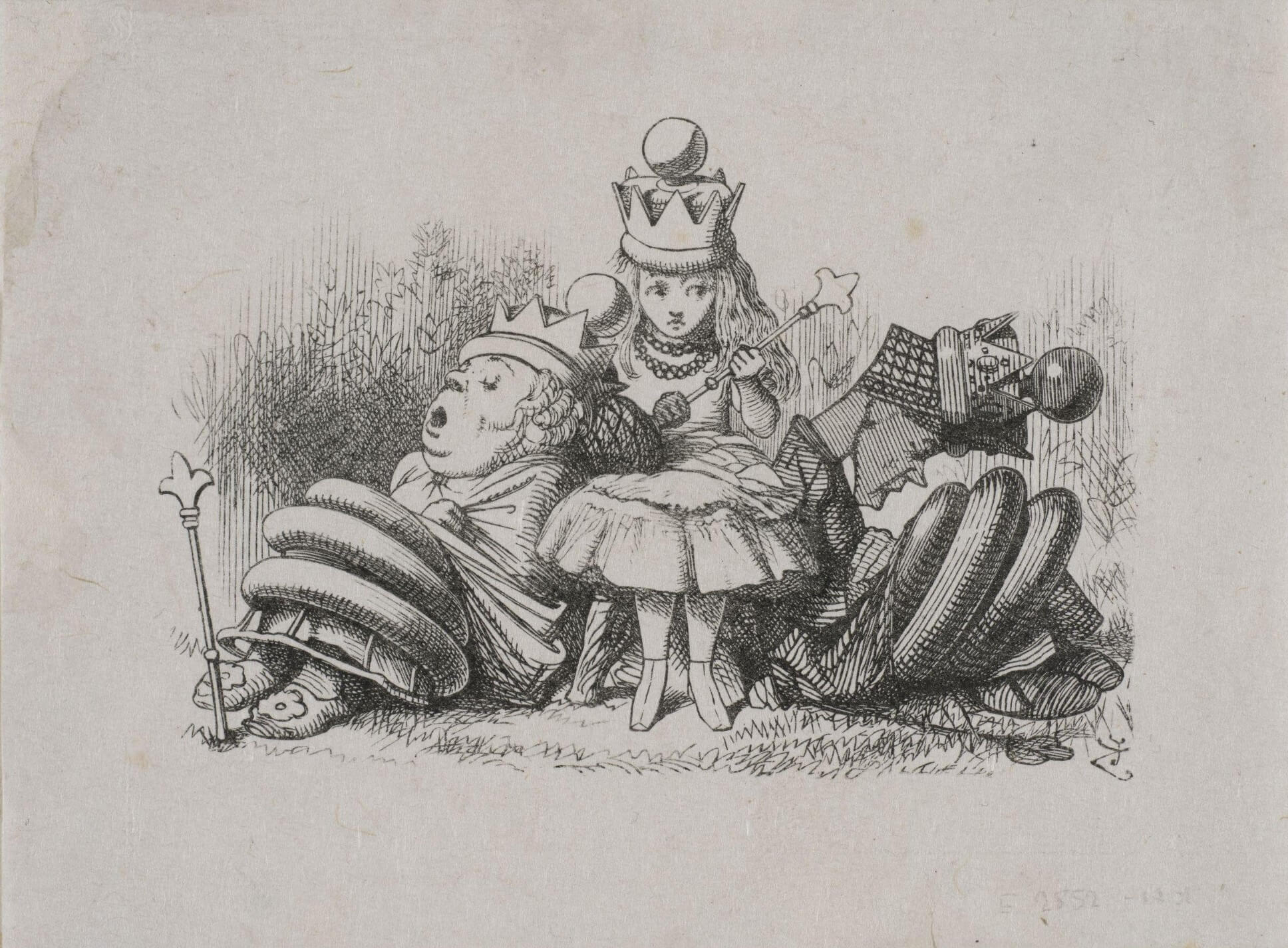 Created for Through the Looking-Glass, and What Alice Found There, published in 1872, John Tenniel’s original engraving showed Alice wearing a bulging dress resembling the base of a chess piece, though Lewis Carroll was unhappy with this, and the image was altered to give her a more fashionable dress. The scene comes from near the end of the story. The action follows the structure of a chess game in which Alice begins as a pawn on the second square of the chessboard landscape and travels across the board. When she finally reaches the eighth square, she is crowned and becomes a queen. This is followed by the chaotic ‘queen’s banquet’ scene, where the table collapses into nonsense and the dream soon ends. |