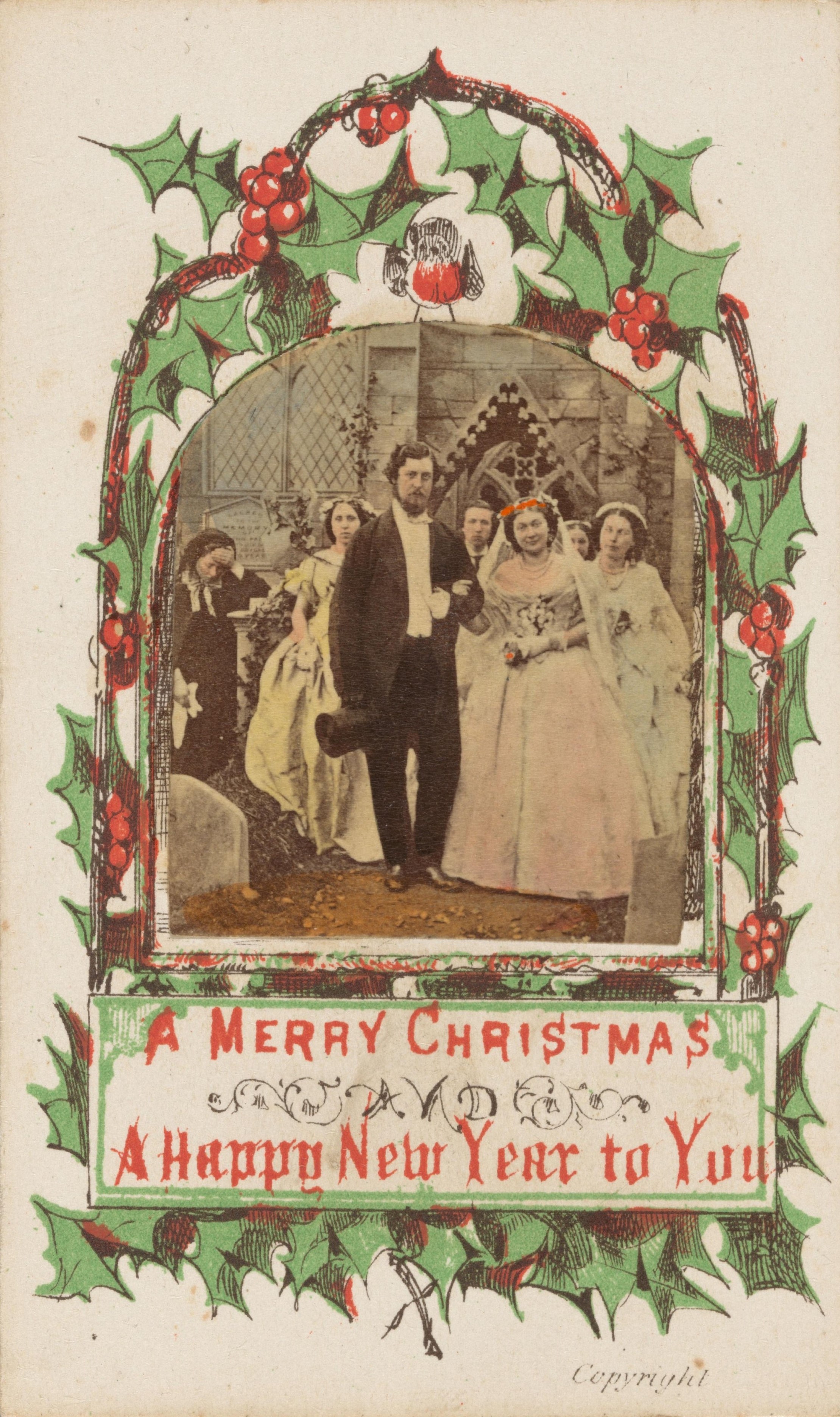| A carte-de-visite greeting card with a bridal couple and their companions standing before gravestones in front of a church, framed by a decorative border and inscribed with the greeting 'A Merry Christmas and a Happy New Year to You'. |