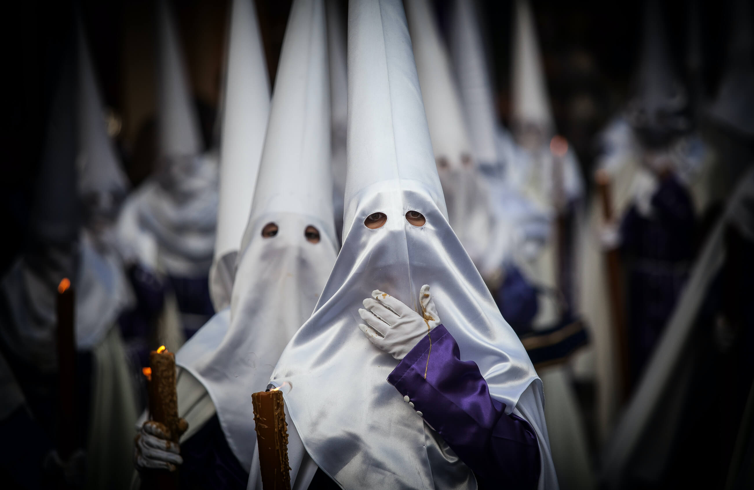 | In Spain and some Spanish‑speaking countries, Holy Week processions include Nazarenos, penitents who wear long robes and pointed hoods called capirotes that cover their faces, symbolising humility and anonymity before God. They march carrying candles or crosses, and in some cases walk barefoot, as an expression of repentance and solidarity with the suffering of Christ. Their anonymous, hooded appearance creates a solemn and reflective atmosphere, expressing faith and devotion and connecting participants to the Passion of Jesus. |
