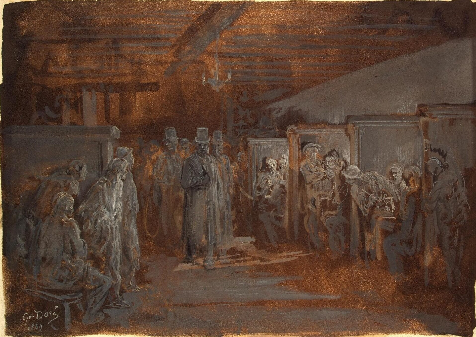 Tavern in Whitechapel Gouache and black ink with white body colour on paper prepared with brown lacquer By Gustave Doré, 1869, for his book London, a Pilgrimage The State Hermitage Museum, Saint Petersburg