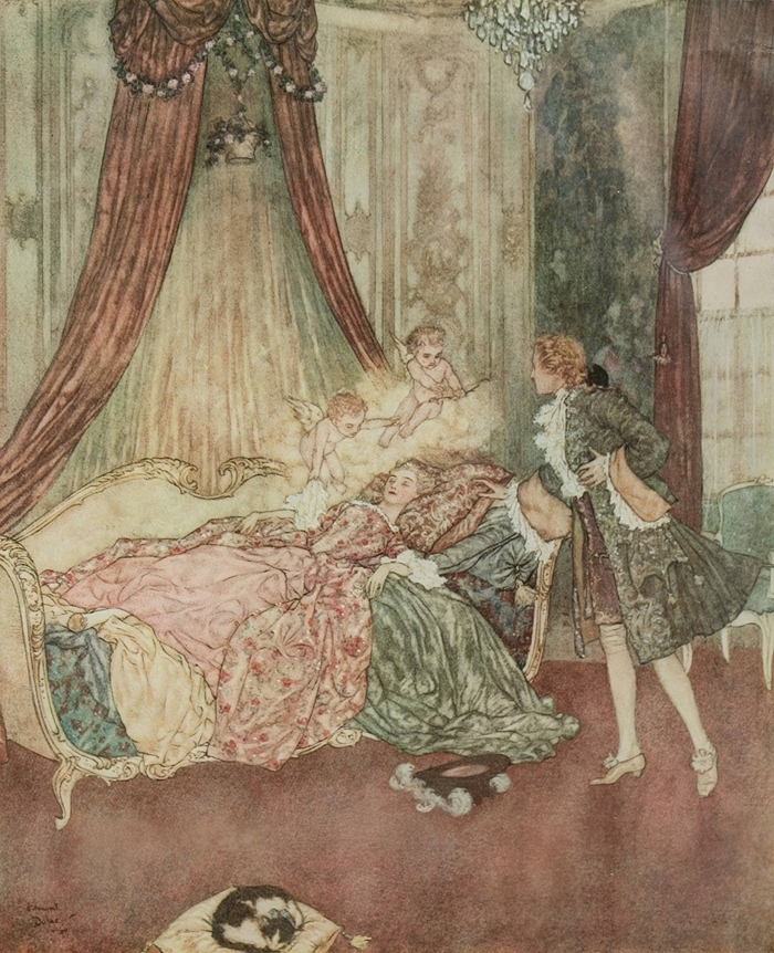 Sleeping Beauty, who is asleep on a couch, while two cupids hover