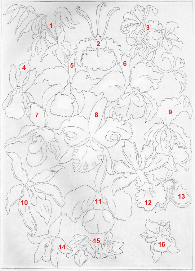 Orchids (Orchidae) Lithograph, by Ernst Haeckel, published 1904 1. Odontoglossum naevium (Odontoglossum naevium) 2. Oncidium kramerianum (Psychopsis krameriana) 3. Odontoglossum ramosissimum (Cyrtochilum ramosissimum) 4. Odontoglossum schroederianum (Oncidium schroederianum) 5. Cattleya ballanthiniana (Cattleya × ballantiniana) (C. trianae) (C. warscewiczii) 6. Cattleya mendellii (Cattleya mendelii) 7. Cypripedium lemoinieri (Phragmipedium × sedenii) (P. longifolium) (P. schlimii) 8. Cattleya rochellensis (Cattleya warscewiczii) 9. Cypripedium leeanum (Paphiopedilum insigne) (P. spicerianum) 10. Odontoglossum wattianum (Oncidium × wattianum) 11. Cattleya labiata (Cattleya labiata) 12. Epidendrum atropurpureum (Encyclia cordigera) 13. Cypripedium argus (Paphiopedilum argus) 14. Paphinia rugosa (Paphinia rugosa) 15. Zygopetalum xanthinum (Promenaea xanthina) 16. Oncidium laxense (Oncidium loxense/Cyrtochilum loxense)