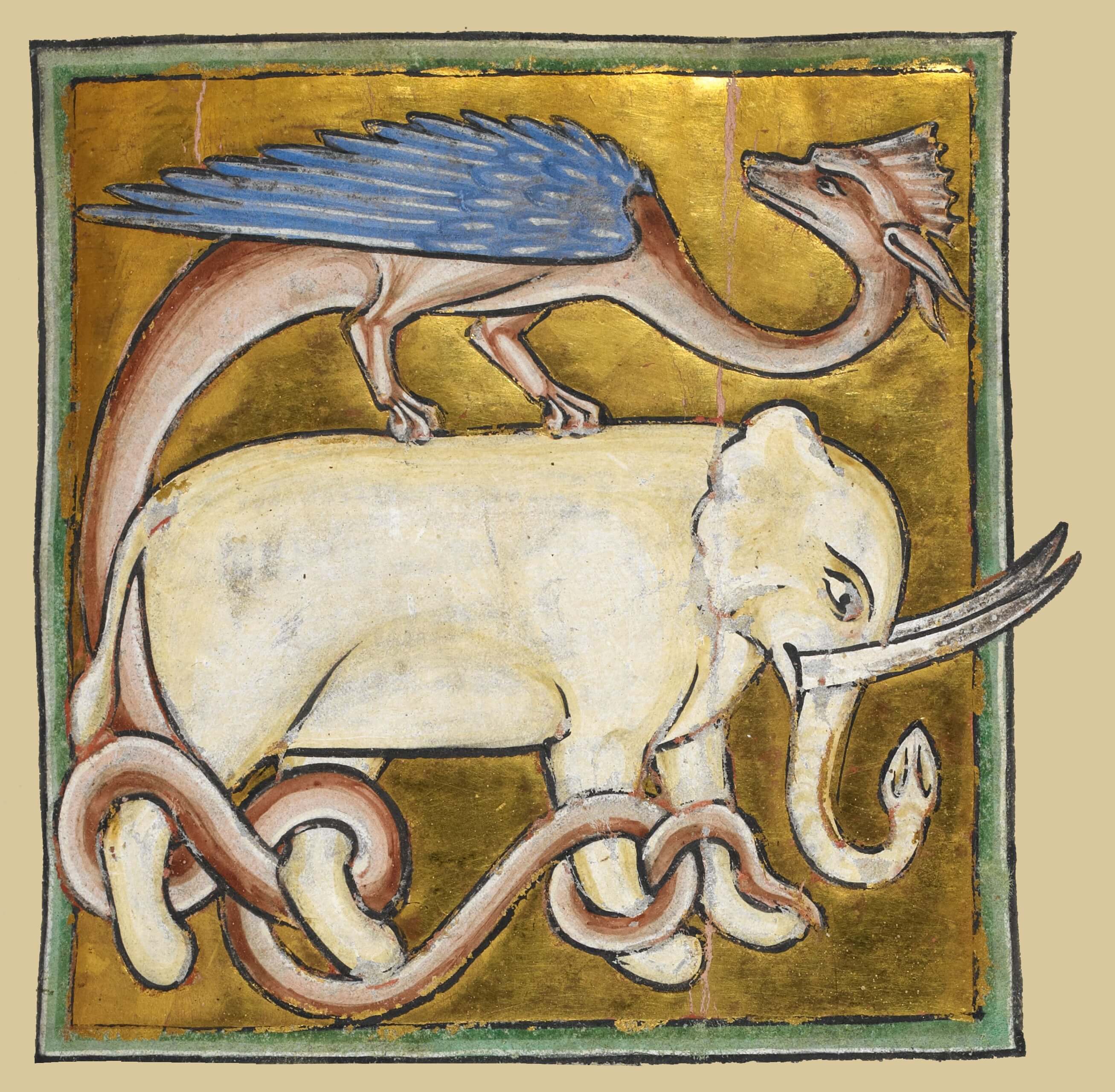 An elephant with a dragon on its back Tempera and gold leaf on parchment, 22 x 26 cm (page), anonymous, c. 1200–1210 The British Library, London |