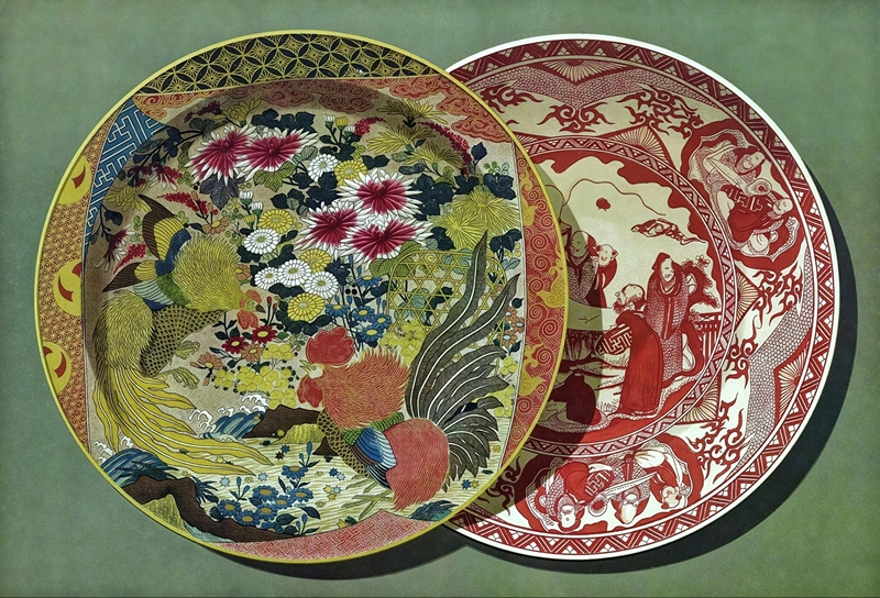 Kaga ware: two dishes Lithograph, by L. Dulong, published 1875 |