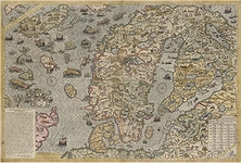 | Olaus Magnus' Carta Marina et Descriptio Septemtrionalium Terrarum, created in 1539, is a map depicting the northern lands, spanning from the south coast of Greenland to the Russian Baltic coasts, including Iceland, the Northern Isles, Sweden, Norway, Denmark, and Finland. It offers the first comprehensive and relatively accurate portrayal of the North, surpassing earlier attempts found in Ptolemaic editions. For many years, the work was thought lost, but a single copy, procured in the sixteenth century and preserved in the Royal and National Library in Munich, was rediscovered in 1886 by Oscar Brenner. The Munich University Library holds a rough hand-drawn copy. In 1558, Niccolò Zeno the younger used the map's data to publish a fictional account of a northern journey allegedly undertaken by his ancestors in 1400, a work that caused a stir until it was later debunked. The map also influenced the work of Sebastian Münster, Gastaldi, and Ortelius. The first edition, known as the Munich copy, was printed in Venice from woodcut blocks and consisted of nine leaves, remaining in circulation for twelve years. The second edition, the Uppsala copy, is held at Uppsala University Library and was engraved in Rome in 1572 on copper plates. Some later reprints were hand-coloured by others. | ||||||||||