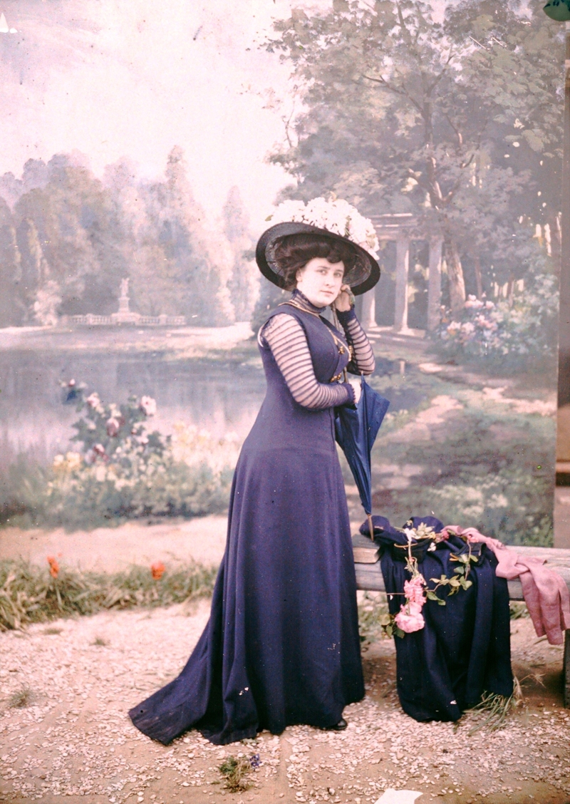 | A woman stands with composed elegance before a lakeside garden backdrop, with the right edge of the frame betraying the authenticity of the scene. The muted tones and slightly grainy, pastel-like effect are characteristic of the autochrome process, and the gentle diffusion softens the formality, giving the scene a quiet, theatrical poise. |