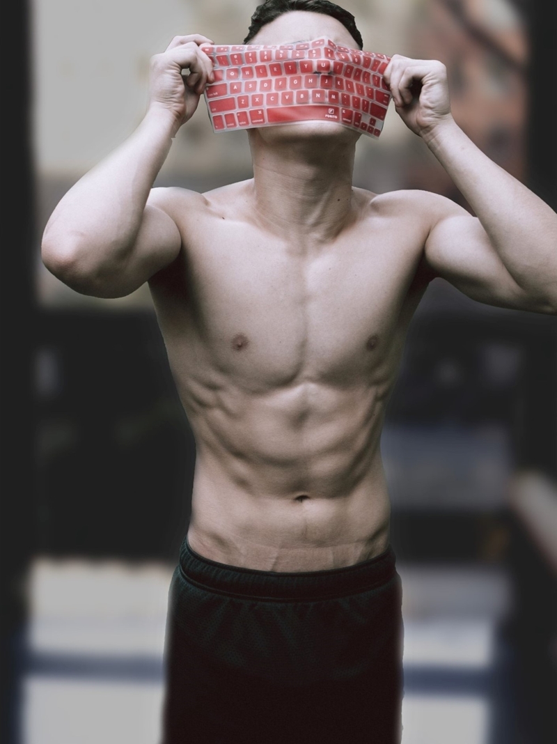 Physical and digital adaptability meet as a brawny man wraps a keyboard around his face, suggesting strength, control, and an oddly serene accord between flesh and circuitry.