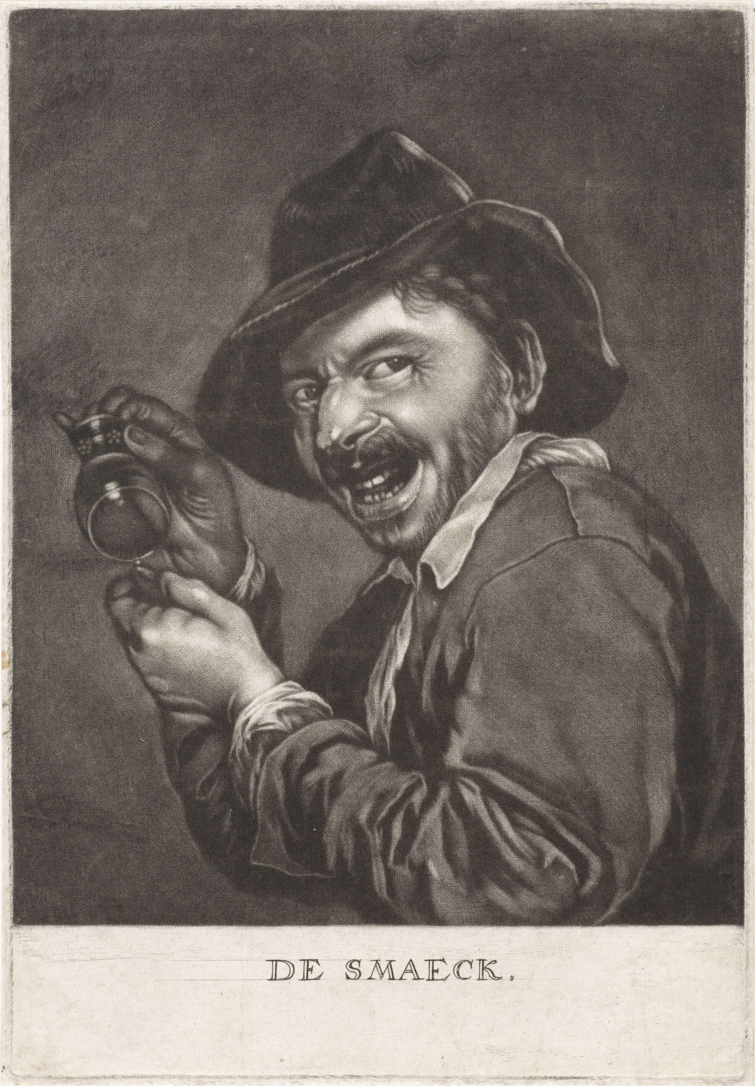 | Part of a series depicting the five senses, here a man’s exaggerated expression—wide eyes, open mouth, and bared teeth—indicating a dramatic reaction to tasting something, yet his glass is clearly empty. This contradiction creates a satirical tone, mocking the performance of taste when there’s nothing to taste. Typical of 17th-century Dutch genre prints, it lampoons gluttony, drunkenness, or pretentious behaviour through visual irony. |